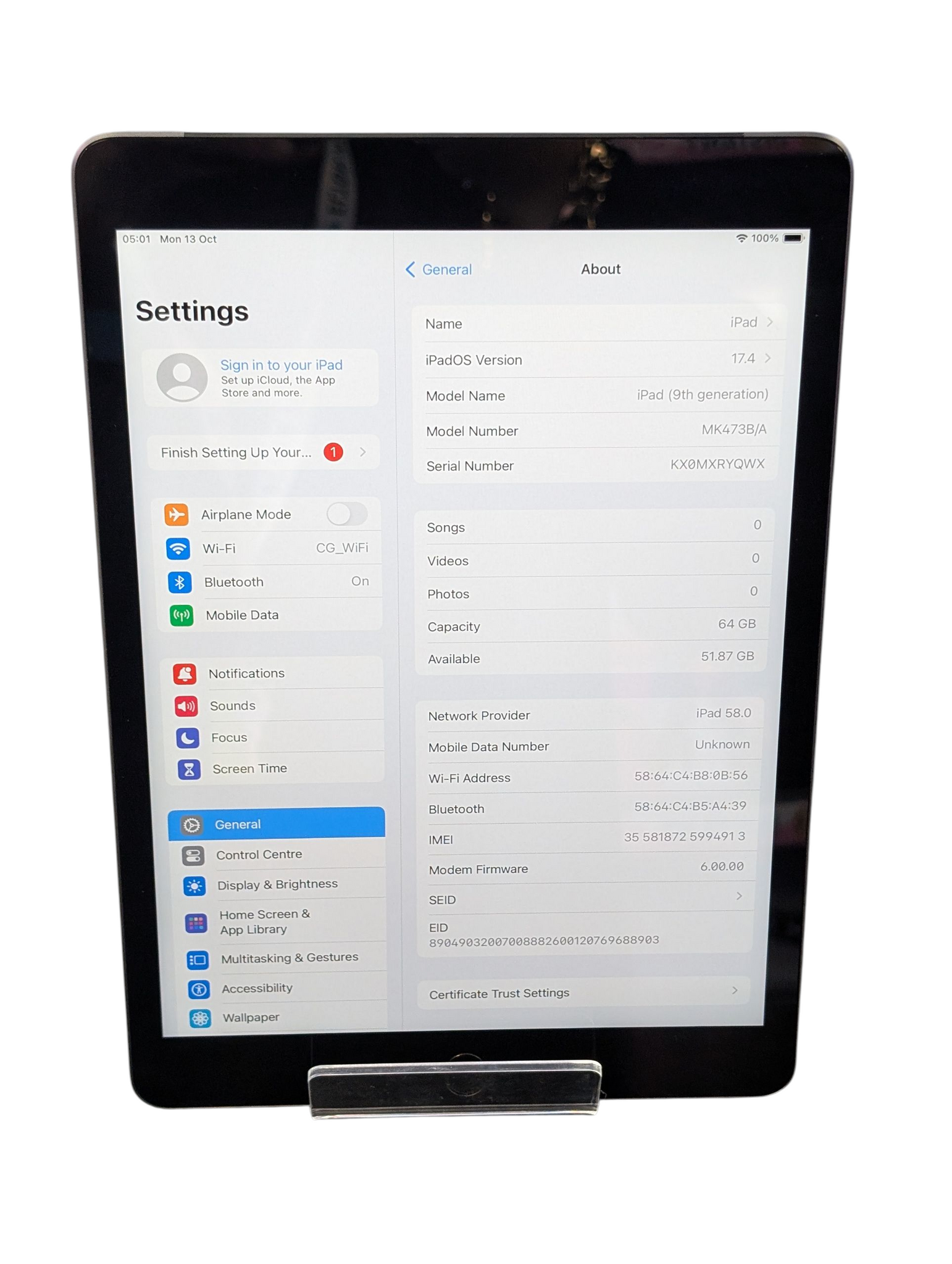 HERE WE HAVE A APPLE IPAD 9TH GENERATION IPAD BOXED IN GOOD CONDITION. THIS COMES FULLY RESET FEATURING WIFI & CELLULAR INTERNET CONNECTIONS. **** FOR ANY QUERIES PLEASE CALL OUR CHORLEY STORE DIRECT MON-SAT 01257 752333