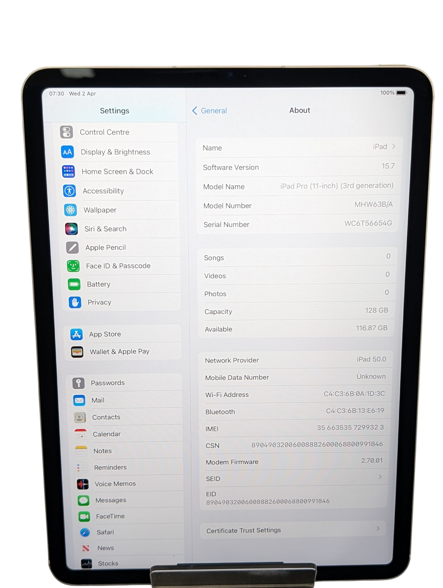 Apple Ipad Pro 3rd gen, this has 128gb storage. This is wifi and Cellular, unlocked to all netoworks. This has light cosmetic wear from general use, this does not effect the performance. Comes unboxed, includes charging cable. ******** FOR ANY QUERIES PLEASE CALL OUR CHORLEY STORE DIRECT MON-SAT 01257 752333