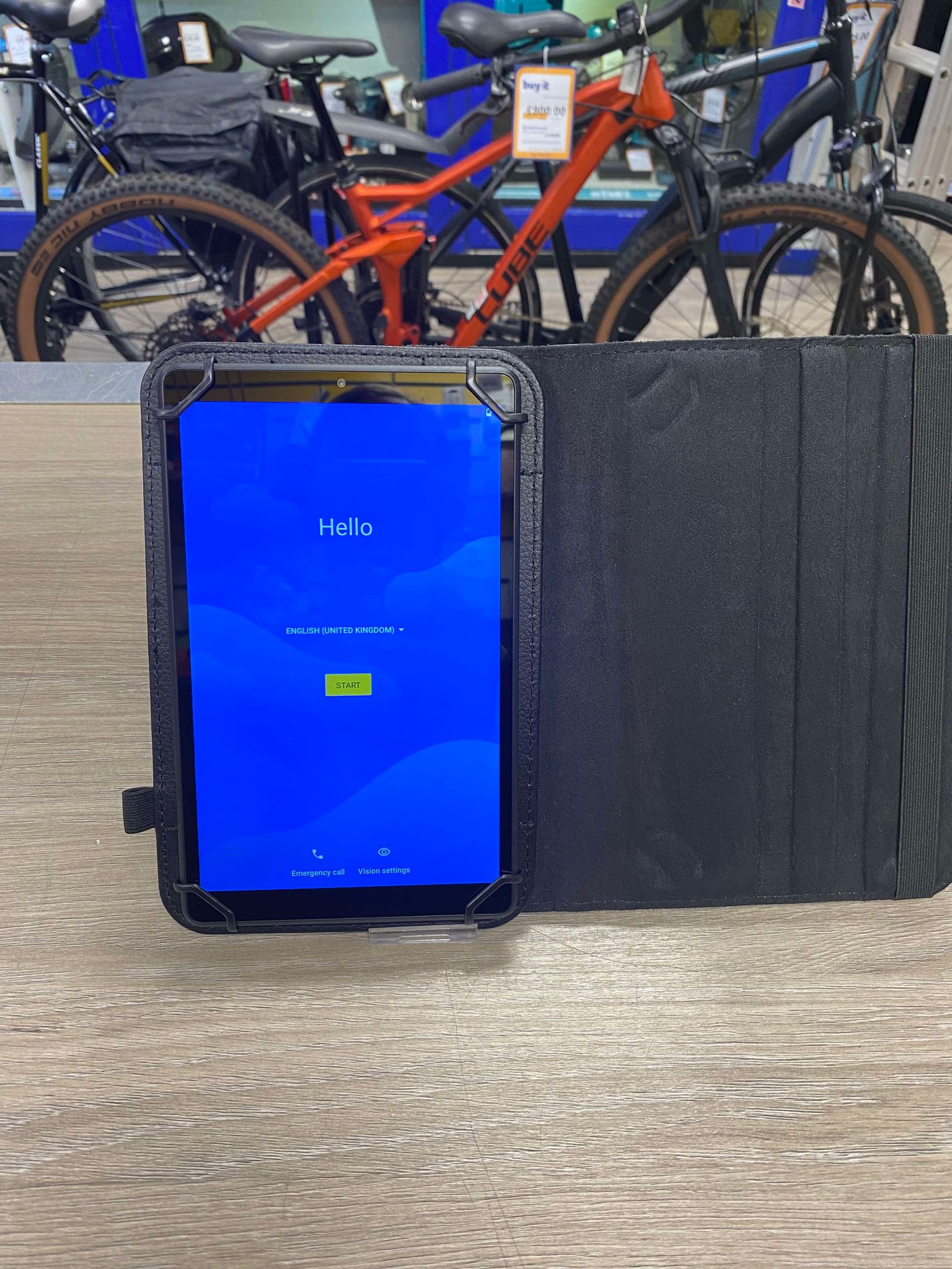 TABLET IS IN GOOD CONDITION SMALL SCTRATCH ON SCREEN, COMES WITH COVER AND CHARGER.