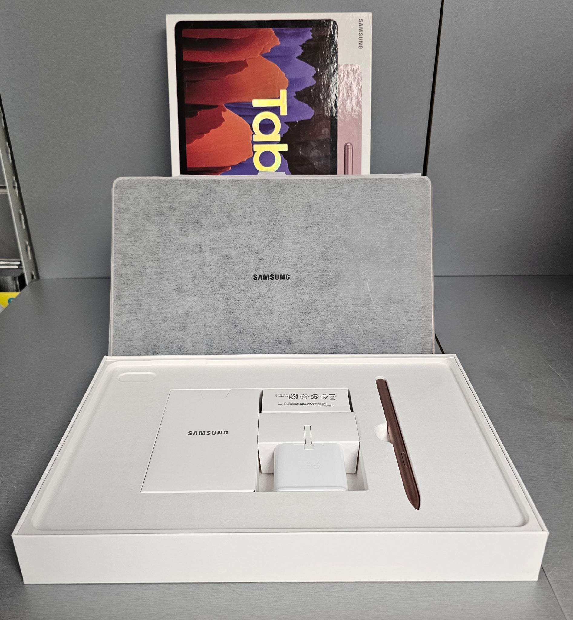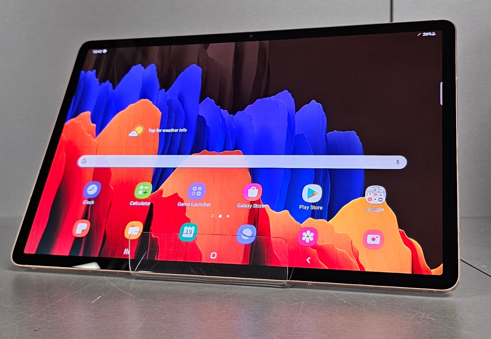 Product information 12.4” Super AMOLED display Stream, surf and create on the Samsung Galaxy Tab S7 Plus 12.4" Tablet. The S7 Plus features a huge 12.4” screen to get lost in, while the Super AMOLED 120 Hz display ensures liquid-smooth viewing. Want your playlist to really pop? AKG tuned quad speakers and Dolby Atmos provides three-dimensional audio that's rich, punch and true to life. Get creative with the S Pen With the new and improved S Pen, you can unleash your inner artist. Whether you're sketching, writing or editing, it's smooth and precise to give you total control over your masterpiece. It even works as a remote, so you can pause your Netflix show or skip to the next slide on your work presentation without touching the screen. Snap a pic Actually use the camera in your tablet with the Tab S7 Plus. With a dual rear camera and an ultra-wide angle lens, you'll get snaps that are just as good (if not better!) than those taken on your Smartphone. Multitasking just got easier Instead of switching apps to catch up on the group chat, see it all on your screen with SplitView. It's handy for chatting to your friends while you watch a video or checking your notes as you write up a report. Plus, extended document editing lets you update and annotate PDFs and much more. Who even needs a laptop? SAMSUNG Galaxy Tab S7 Plus 12.4" Tablet - 128 GB, Mystic Bronze, Android 10.0, Super AMOLED display, 128 GB storage: Perfect for saving pretty much everything, Add more storage with a microSD card, Battery life: Up to 14 hours, Dolby Atmo
