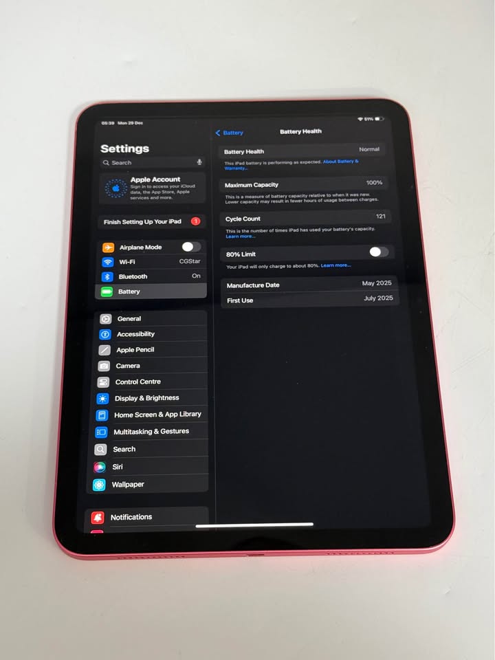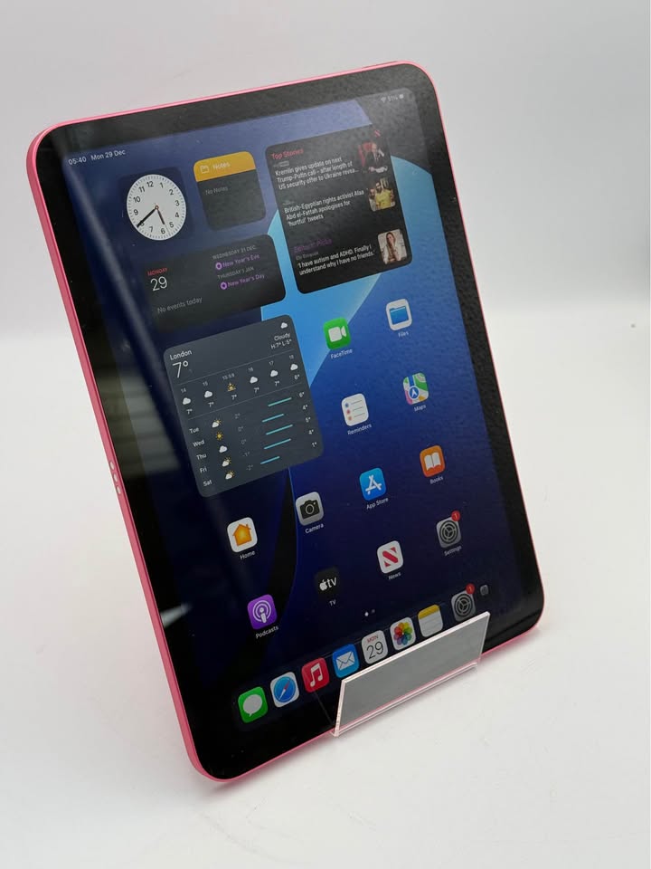 The Apple iPad A16 (Model A3354) is the 11-inch, 11th Generation model, featuring a vibrant Liquid Retina display, the powerful A16 Bionic chip, 128GB storage, Wi-Fi 6, and a sleek pink finish, perfect for everyday use, creativity, and productivity with its enhanced cameras (including Center Stage) and support for essential accessories like the Apple Pencil and Magic Keyboard Folio, all running on the intuitive iPadOS. Key Features: Display: 11-inch Liquid Retina (LED-backlit Multi-Touch with IPS), True Tone, 2360x1640 resolution. Processor: A16 Bionic Chip (5-core CPU, 4-core GPU, 16-core Neural Engine) for fast performance. Storage: 128GB. Color: Pink. Connectivity: Wi-Fi 6 (802.11ax) and Bluetooth 5.3. Cameras: 12MP Wide rear camera with True Tone flash, 12MP Landscape front camera with Center Stage. Audio: Landscape stereo speakers and built-in microphones. Security: Touch ID sensor built into the top button. Ports: USB-C (supports charging, DisplayPort, USB 2.0). Battery: All-day battery life (up to 10 hours Wi-Fi use). Operating System: iPadOS (offers multitasking with Stage Manager, Scribble, etc.). Accessories: Supports Apple Pencil (USB-C/1st Gen) and Magic Keyboard Folio for added versatility.