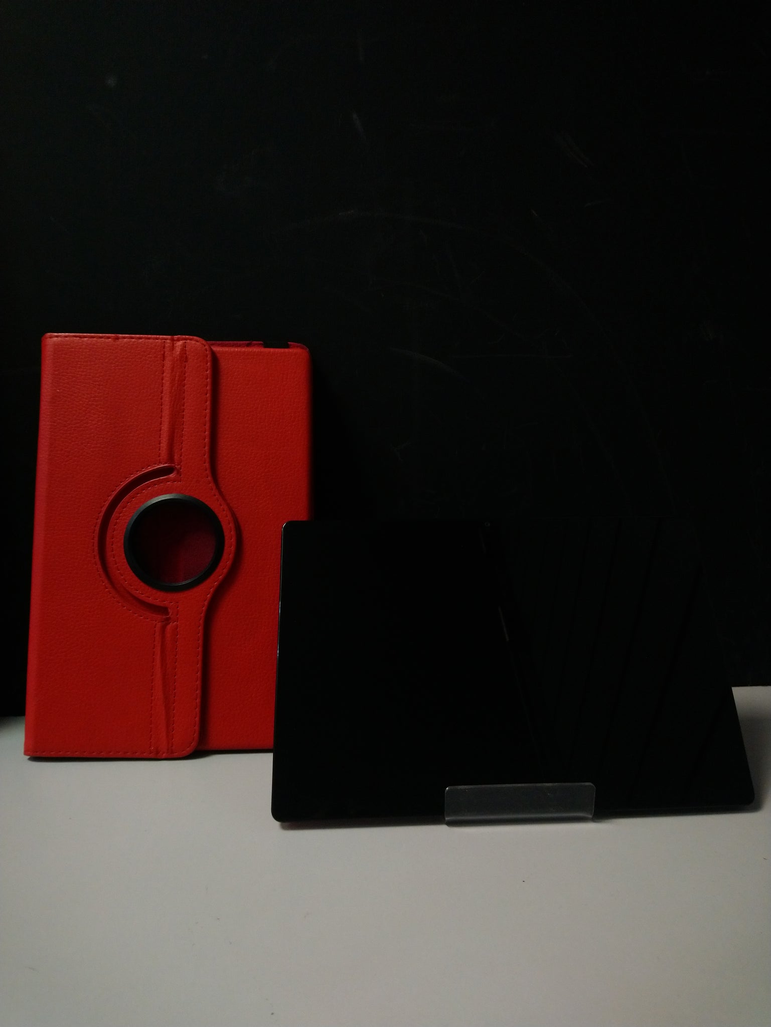 In good working condition. There is a mark on the back of the tablet where the case has been, there are also a few light scratches to the screen. Nothing that affects the way this product works, Includes case