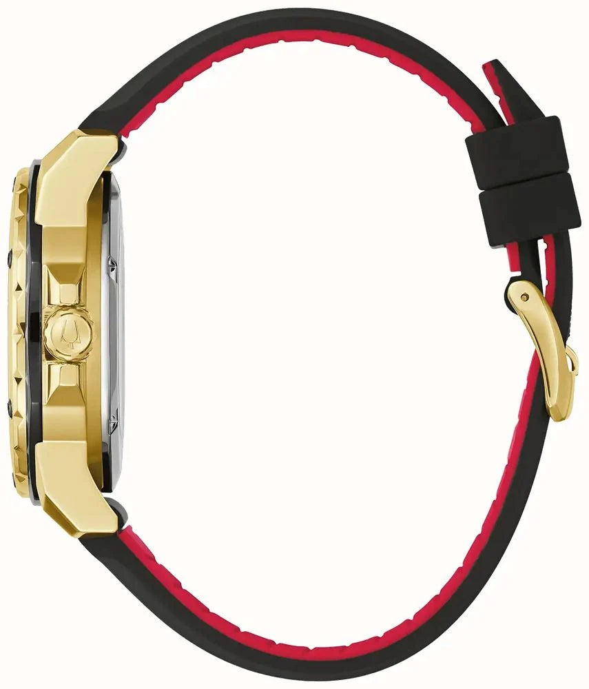 Bulova Bulova Men's Marine Star Automatic Black Dial / Black Silicone Strap Model Specifications 98A272: This watch is part of the brand's Marine Star Automatic Collection. The timepiece features a black dial with one sub-dial and a cut-out feature. The dial exhibits gold Roman numeral and baton indices with gold hour and minute hands. Mineral crystal protects the dial. The gold-tone stainless steel case features black details and measures 45mm in diameter. It features an exhibition case back. This watch is secured on the wrist using a black silicone strap that fastens using a pin buckle. An automatic movement powers this timepiece. This model is water resistant up to 200 metres (20 bar).