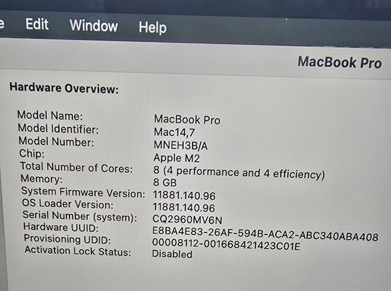 Processor Apple M2 Pro chip processor 8-core CPU with 4 performance cores and 4 efficiency cores 10-core GPU 16-core Neural Engine 100GB/s memory bandwidth RAM 8 GB RAM Storage 256 GB SSD Display 13.3-inch LED-backlit Retina IPS display 2560x1600 native resolution at 227 pixels per inch with support for 1 million colours 500 nits brightness 16:10 ascept ratio Supports one external display with up to 6K resolution at 60Hz Wide colour (P3) True Tone technology Video Simultaneously supports full native resolution on the built-in display at 1 million colours Thunderbolt 3 digital video output Native DisplayPort output over USB‑C VGA, HDMI, DVI and Thunderbolt 2 output supported using adapters (sold separately) Audio Stereo speakers with high dynamic range Wide stereo sound Support for Spatial Audio when playing music or video with Dolby Atmos on built-in speakers Spatial Audio with dynamic head tracking when using AirPods (3rd generation), AirPods Pro, and AirPods Max Studio-quality three-mic array with high signal-to-noise ratio and directional beamforming Input Devices Backlit Magic Keyboard with 65 (US) or 66 (ISO) keys and 4 arrow keys in an inverted "T" arrangement Touch ID Ambient light sensor Force Touch trackpad for precise cursor control and pressure-sensing capabilities, enables Force clicks, accelerators, pressure-sensitive drawing and Multi-Touch gestures Networking 802.11ax Wi‑Fi 6 wireless networking IEEE 802.11a/b/g/n/ac compatible Bluetooth 5.0 wireless technology Expansion 2 Thunderbolt/ 4 (USB‑C) ports with support for charging and DisplayPort Thunderbolt 3 (up to 40Gb/s) USB 4 (up to 40Gb/s) USB 3.1 Gen 2 (up to 10Gb/s) 3.5 mm headphone jack General macOS 720p FaceTime HD camera Advanced image signal processor with computational video