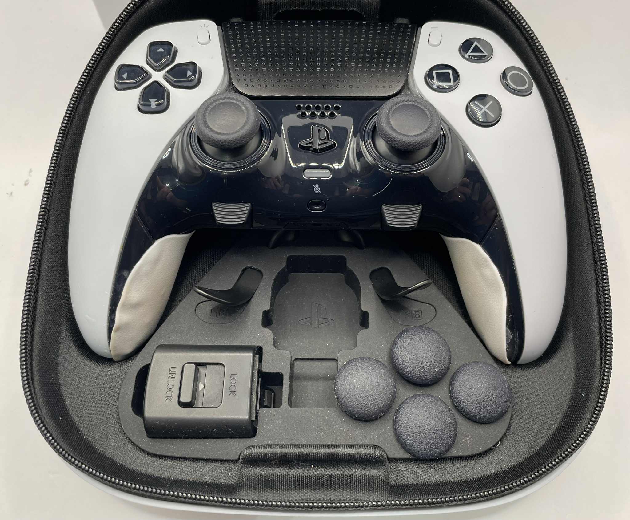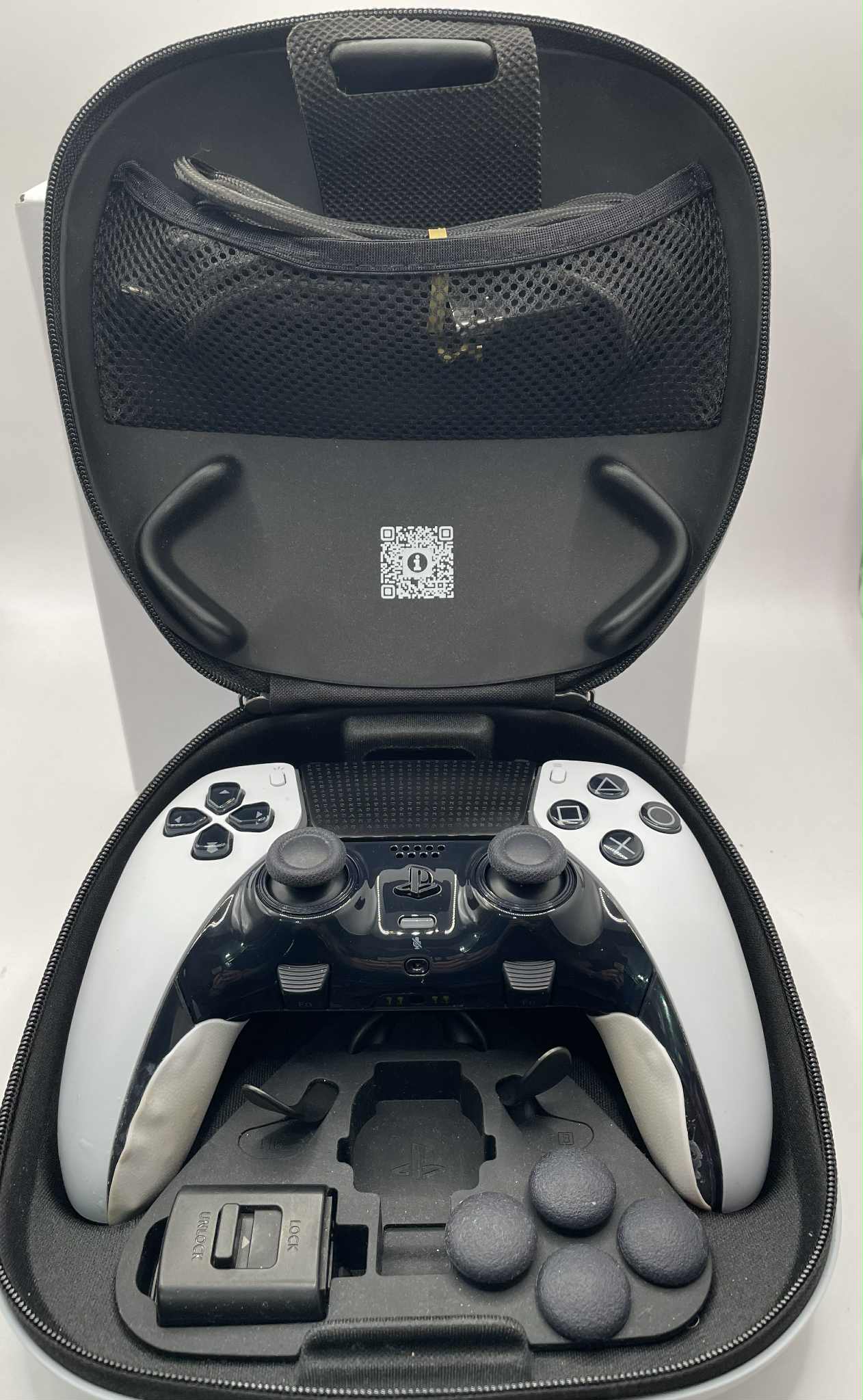 PS5 Dual sense controller Comes with cable, 2 standard caps, high and low dome caps,half dome back buttons, lever back buttons, connector housing, carrying case and box Good working condition - inner pads peeling off as it is seen in photos