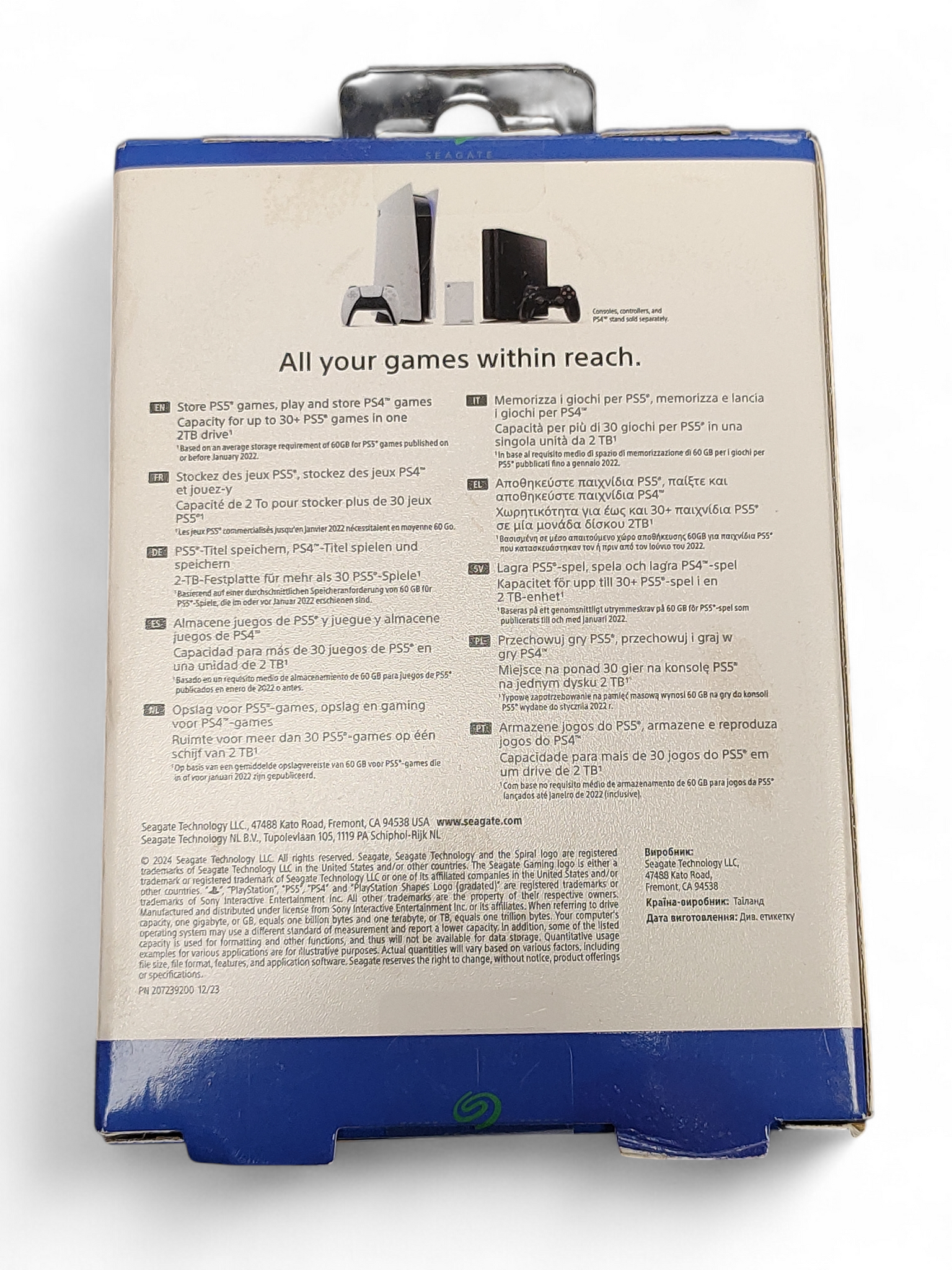 Extend your gaming storage with Game Drive for PS5. Officially licensed for PlayStation, this HDD works seamlessly with PS5 and PS4 consoles - while adding a splash of Blue LED lighting to any gaming atmosphere. Easily archive your PS5 games on the drive until it's time to transfer and play them. Plus, 2TB of add-on storage means a bigger library without having to delete titles. Built with matching firmware to seamlessly work with all models of PS5 and PS4. Storage space 2TB. USB 2.0. USB 3.0.