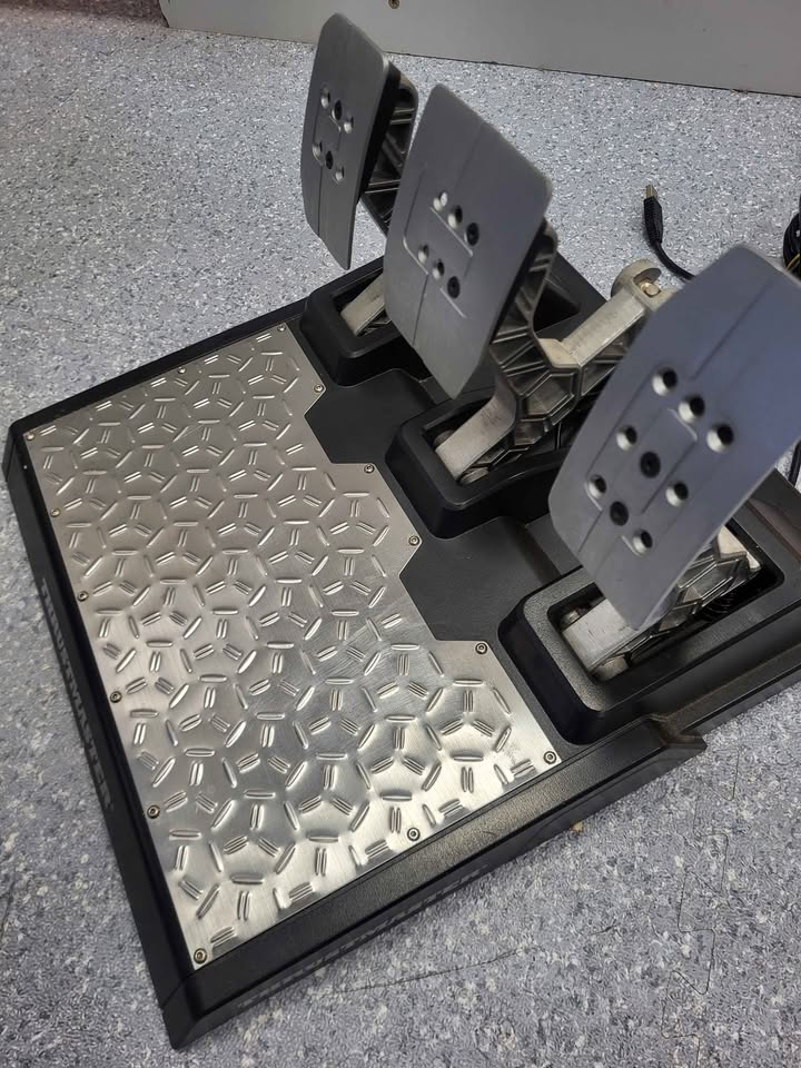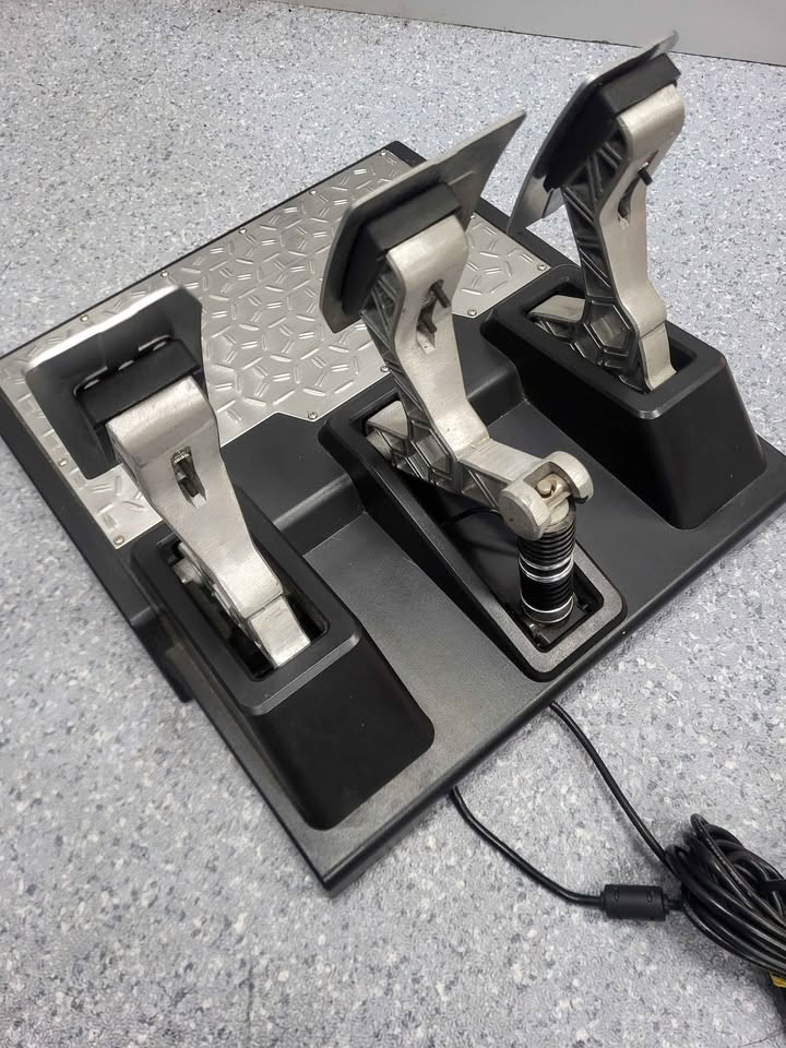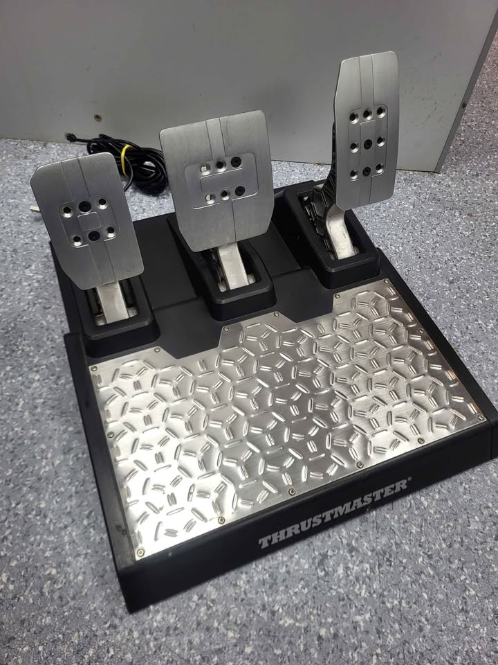 Thrustmaster T - LCM Magnetic & Load Cell Pedals ( PC/PS4/XB1 ) Pre Owned Comes unboxed The brake pedal of the T-LCM pedal can be adjusted for certain playing intensities and your own driving style. This allows you to find the right braking force according to the force exerted on the brake pedal. The included 6-spring spring set allows for a variety of quick adjustments and the braking feel to suit your own preferences. The pedal set is mounted on a stable, resistant support structure. Pedal heads and arms are made of 100% metal and provide special grip for even the most experienced racers to improve the steering feel during the race. The pedal positions of the 3 pedals are adjustable in height, distance and angle of inclination. The calibration software also allows the electronic adjustment of brake force and deadzones for all 3 pedals. The large, textured footrest prevents unintentional slipping of the feet. The heavy duty pedal set weighs more than 5 kg and offers continuous and reliable stability.