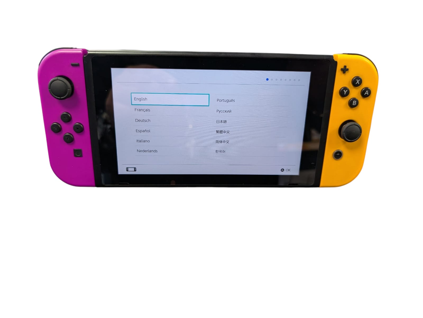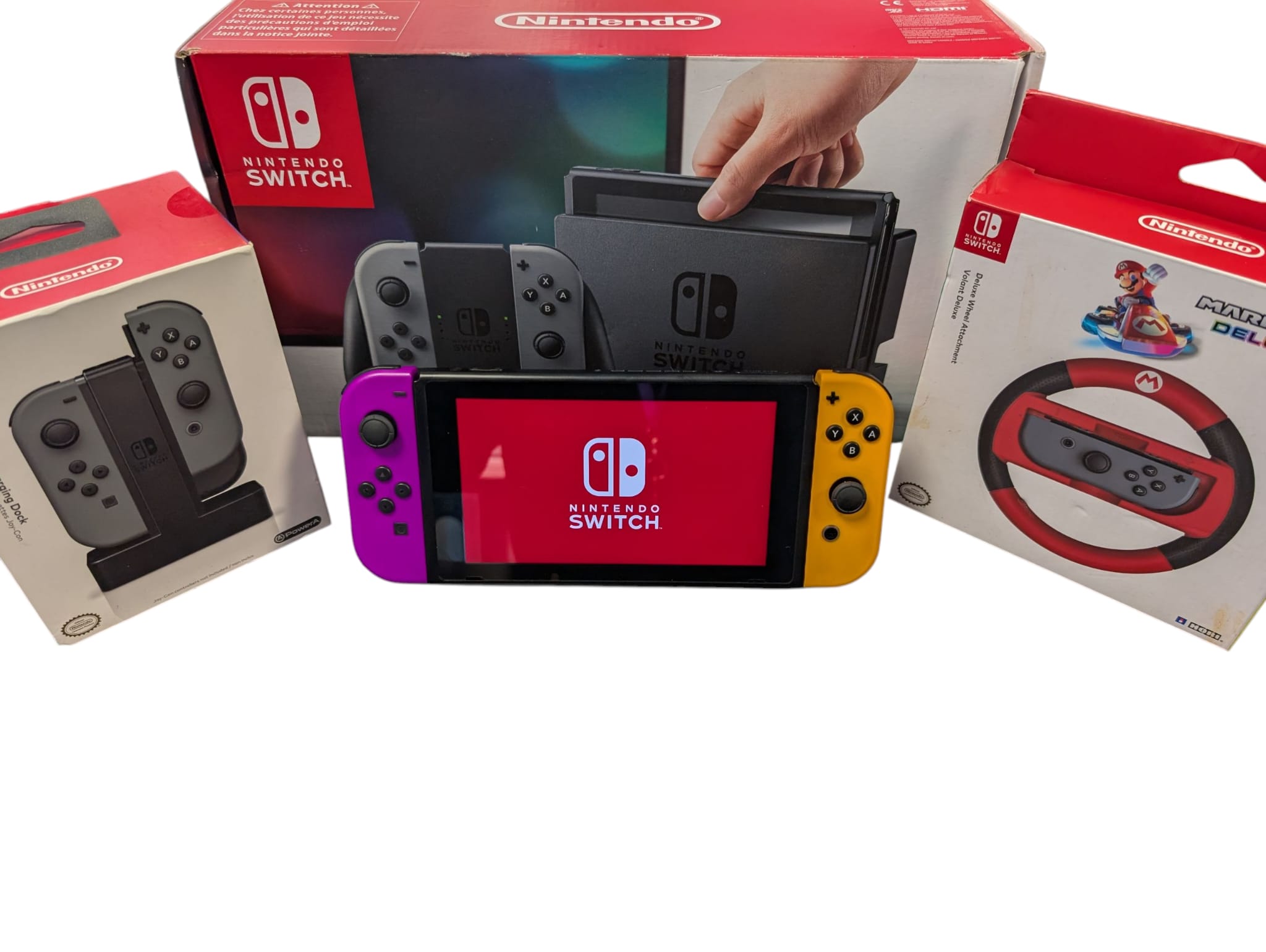 Nintendo switch console, this console is in good working order, this comes boxed with with hdmi lead, power lead and docking station. Comes with boxed joycon charging dock and wheel as shown boxed. Joycons purple and orange. Console has only light cosmetic marks overall this is in good condition. ************************** For more information regarding this item call our Chorley store on 01257 752333 open Mon-Sat between 9am - 5pm