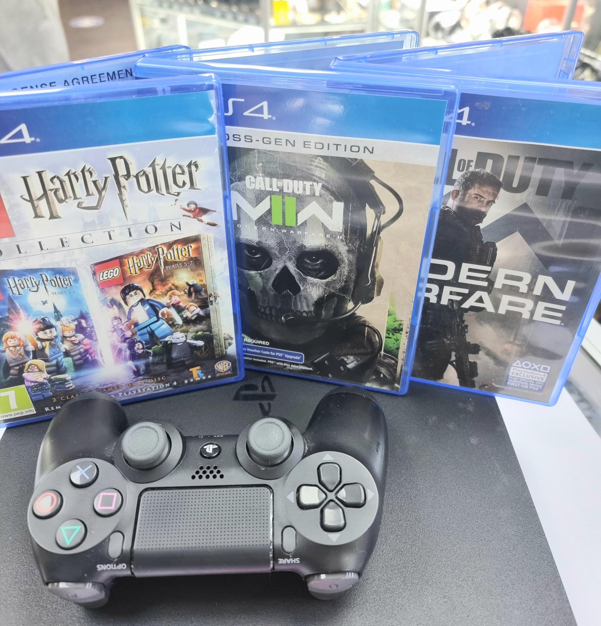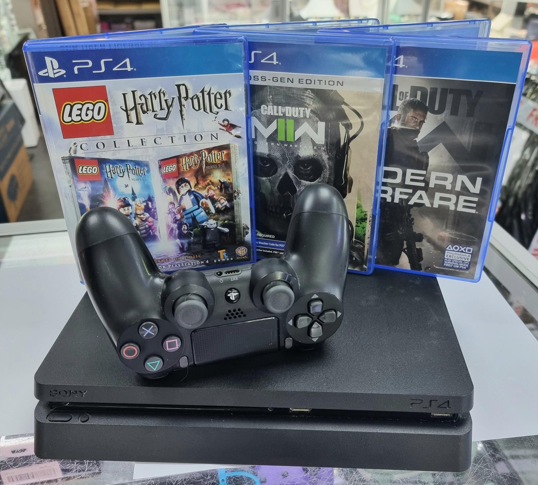 Discover worlds of immersive gaming and top-tier entertainment with PlayStation 4 Slim. It's smaller, lighter, and consumes less power than its full-sized predecessor, but still delivers the same high-octane gaming experience all presented in stunning Full HD 1080p. This bundle includes a copy of Call of Dute Modern warfare + Modern warfare 2 and harry potter lego collection