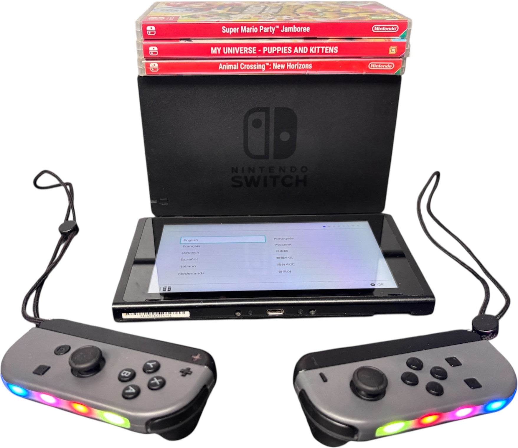 Nintendo Switch comes with RGB JoyCons, Charging Dock, A USB-C Lead & 3 Games (Super Mario Party Jamboree, My Universe Puppies and Kittens & Animal Crossing: New Horizons). Signs of use on console as no stand on back of console & scratches on screen.