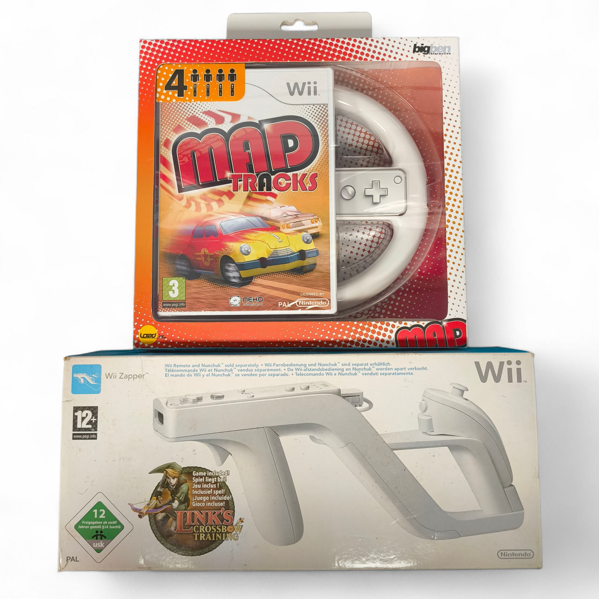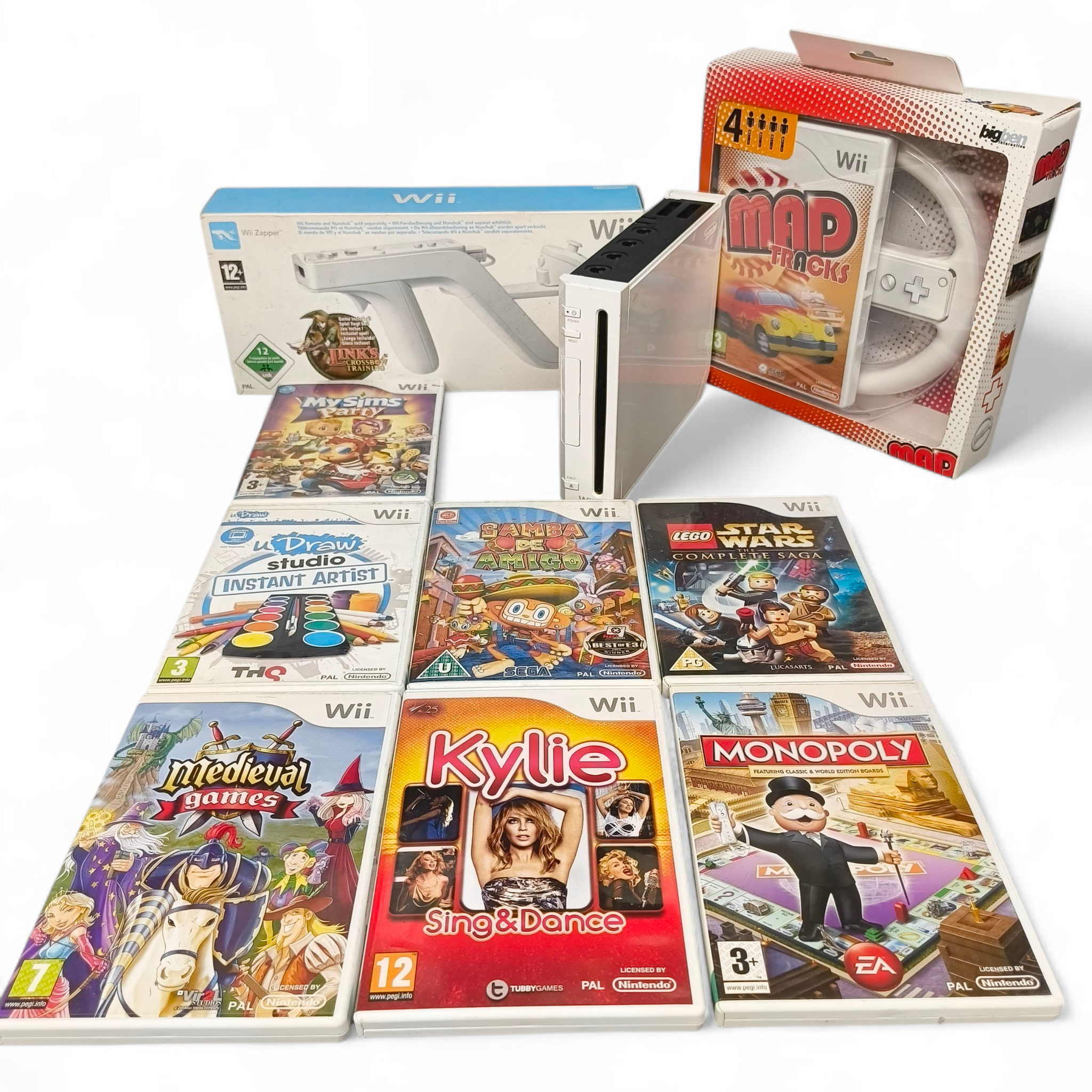 Completely new interface. Wii Remote Control. In addition, game software from Family Computer, Super Famicom, Nintendo 64, Mega Drive, and PC engine can be downloaded (for a fee) and played via the Internet. The Wii Remote Control, which requires only one hand to point to the TV screen. It can be operated intuitively by shaking, twisting, or pointing regardless of age, sex, or gaming experience. Includes the games Monopoly, Medieval Games, Kylie Sing & Dance, Lego Star Wars The Complete Saga, Samba De Amigo, U Draw Studio, MySims Party, Mad Tracks (with steering wheel accessory) & Links Crossbow Training (with Wii Zapper accessory).