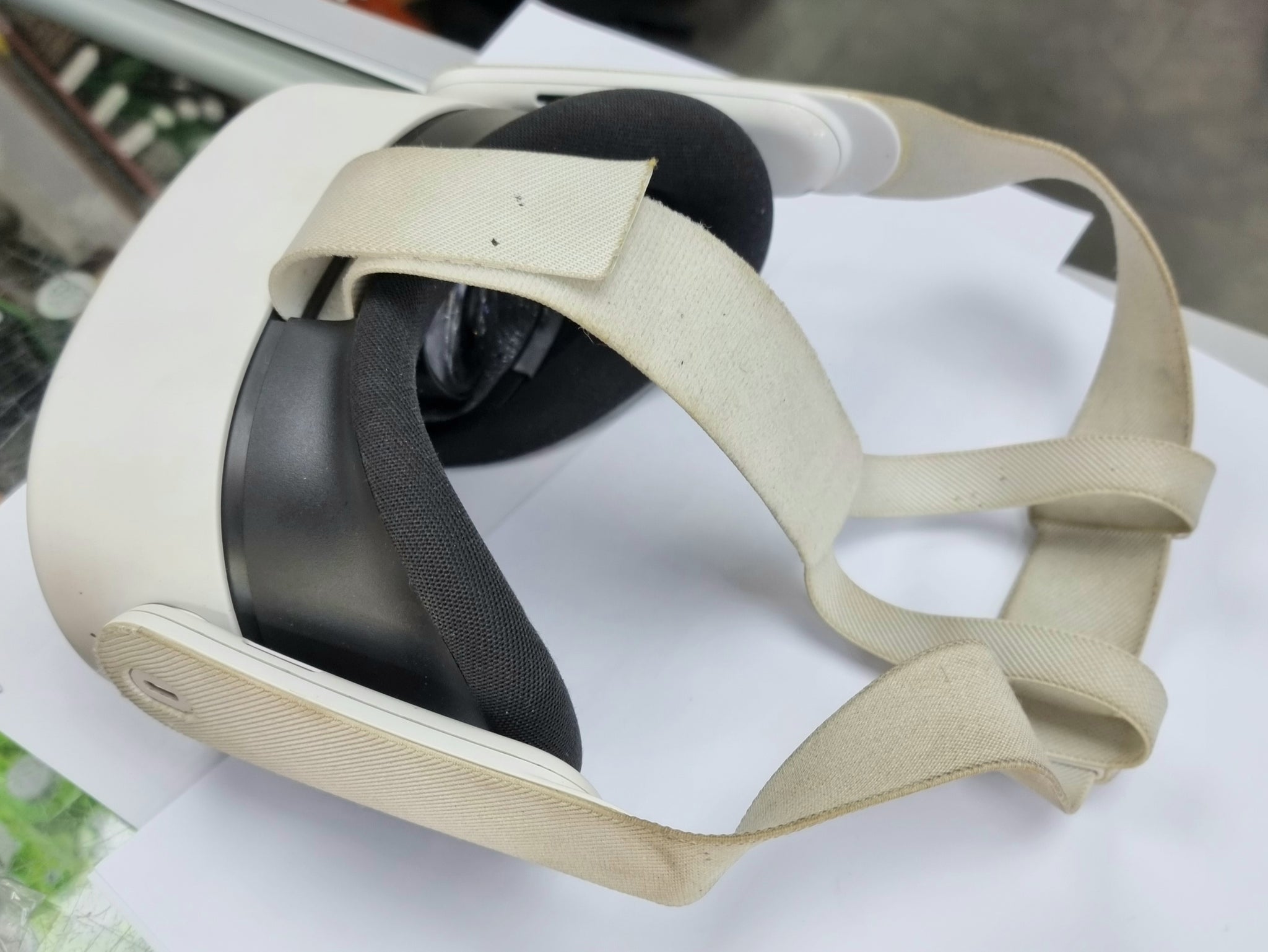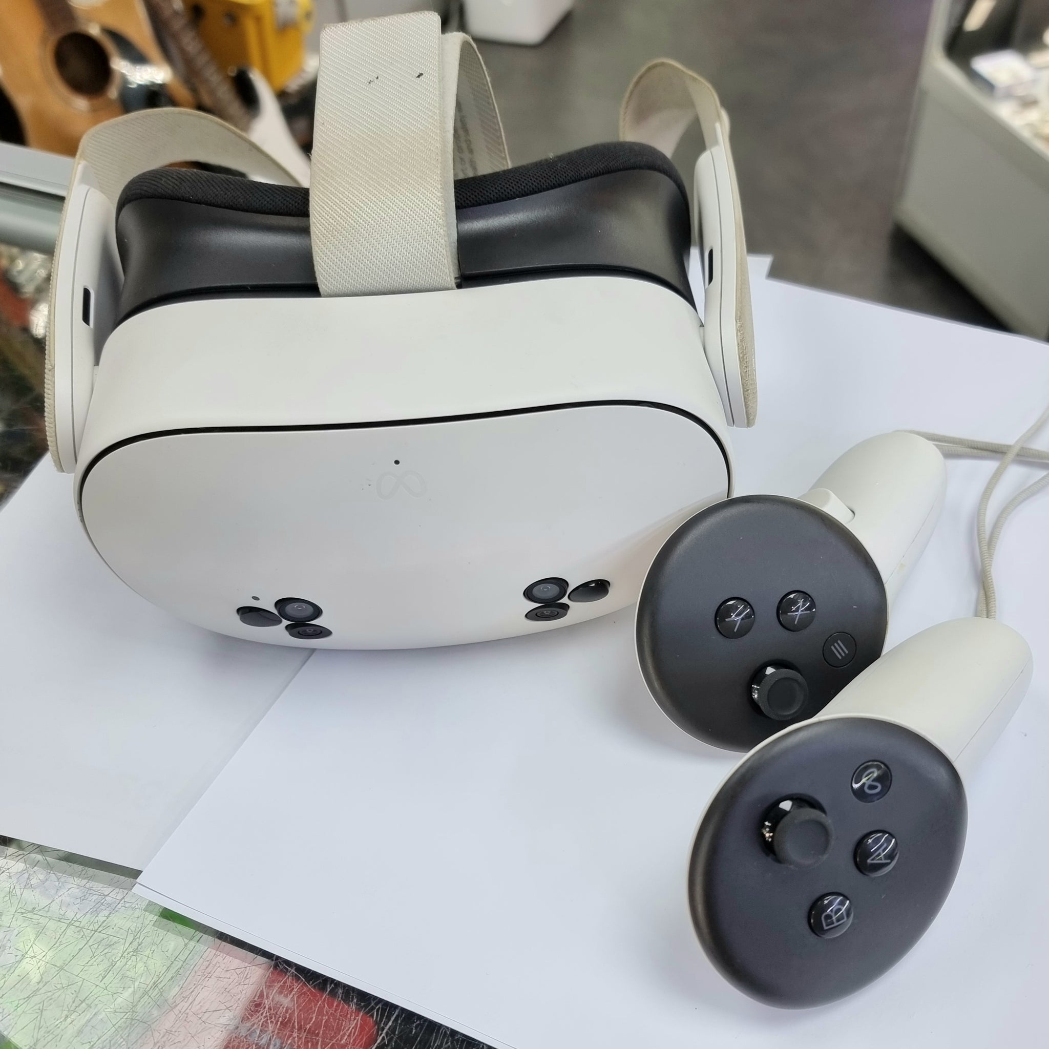 This is fully reset with controllers and charger . The headstrap is slightly discoloured from previous use, this does not effect perfomance.