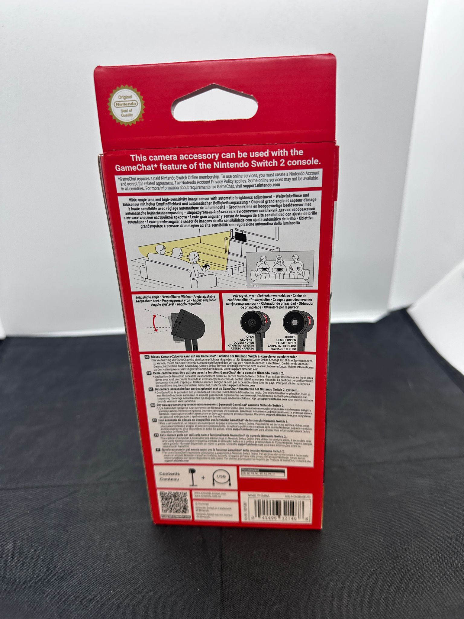A dedicated USB-C\u017d camera made especially for Nintendo Switch 2. Includes one USB-C\u017d charging cable. Whether in TV mode, tabletop mode, or handheld mode, you can video chat with friends or use other in-game camera features by plugging this camera into the USB-C\u017d port on top of the system. Place the Nintendo Switch 2 camera wherever you like and adjust its angle to get the best shot. The lens can capture a wide view, too, so even big rooms or groups of people can get in on the fun! Its compact size makes the camera easy to move and place where you need it to be. The wide-angle lens can be freely adjusted to get everyone in on the action, no matter the room size. Plus, a high-sensitivity image sensor can adjust the brightness automatically to detect faces. When you're not using the camera, you can cover the lens with the built-in privacy shutter. Note: This accessory is designed specifically for use with Nintendo Switch 2.