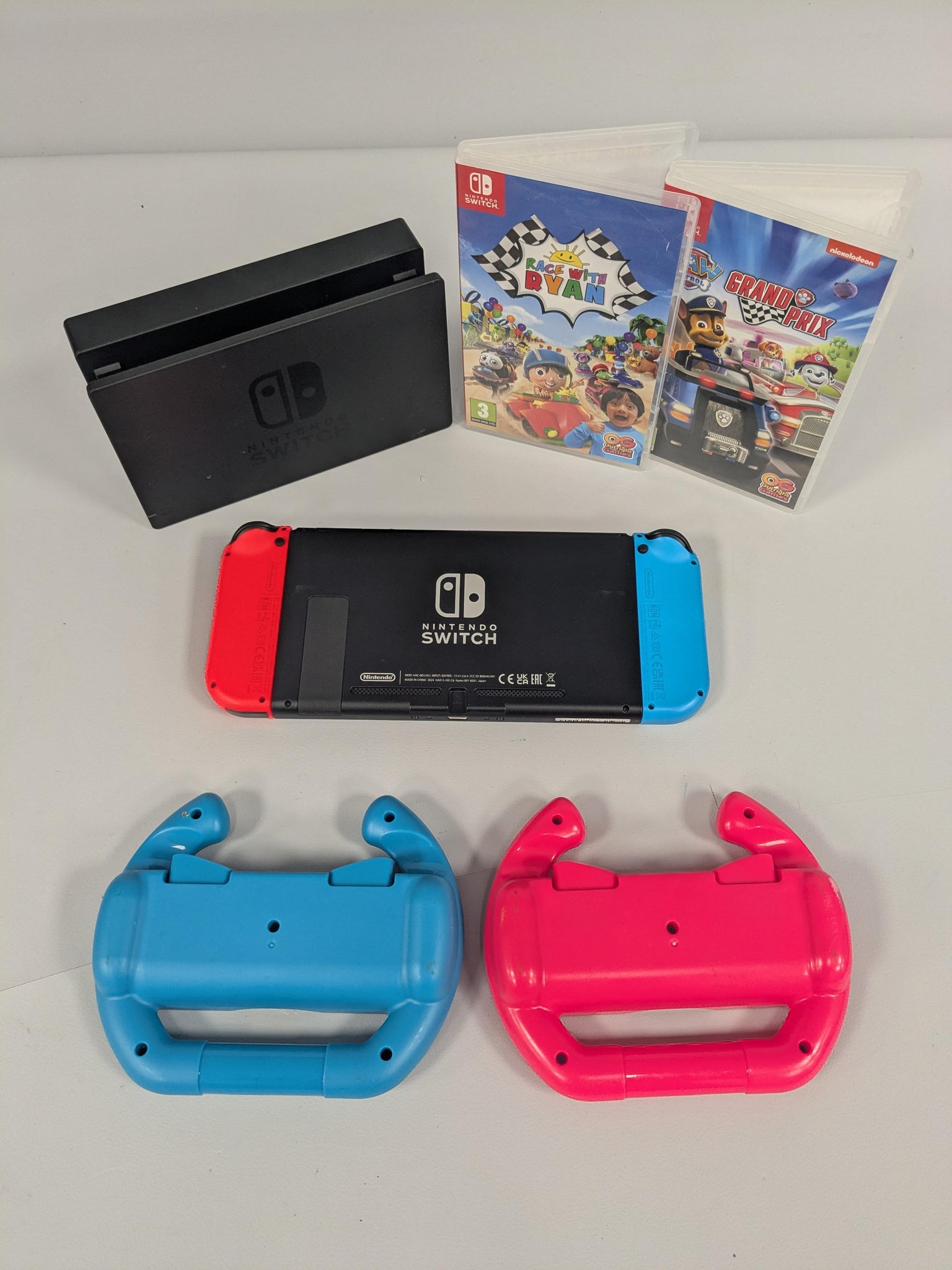 In good condition with dock,leads, joy-cons, games shown & wheels