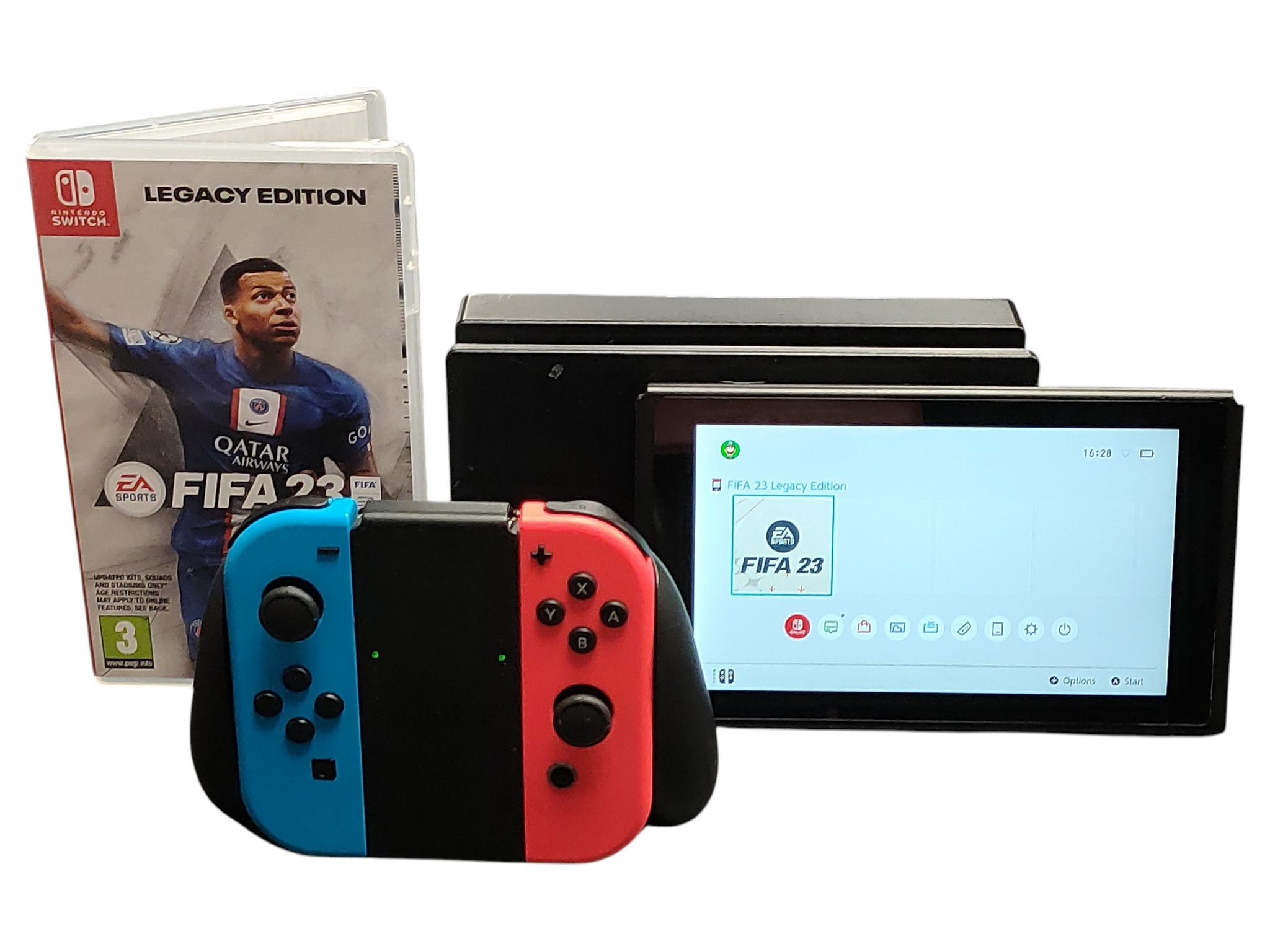 Has some cosmetic marks on the screen & missing kickstand but in good working order. Comes with dock, venom charger, joy-con grip & FIFA23 Boxed.