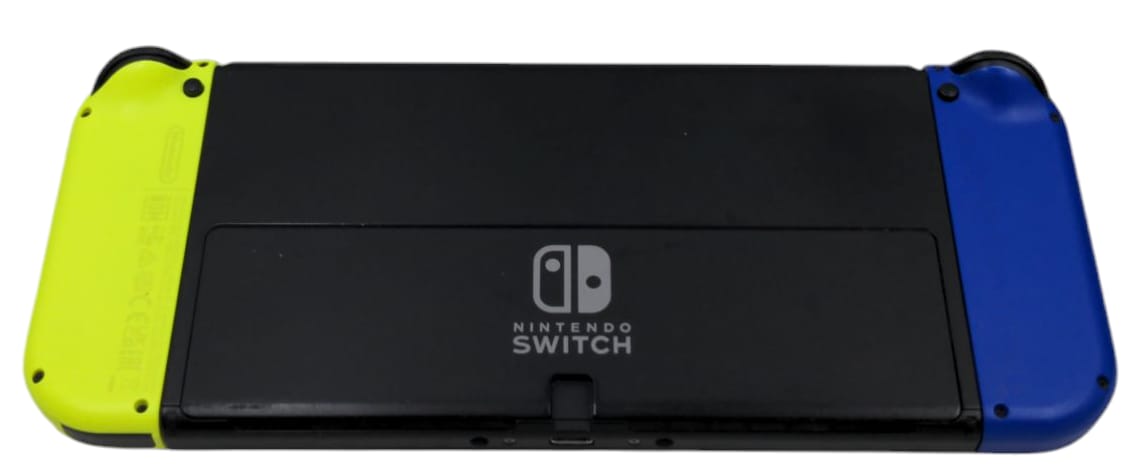 Nintendo Switch OLED, Blue/Yellow Joycons. Comes with box. Joycon pad, HDMI cable and power lead. Is in good used condition. Screen does have scratching and marks. Used.