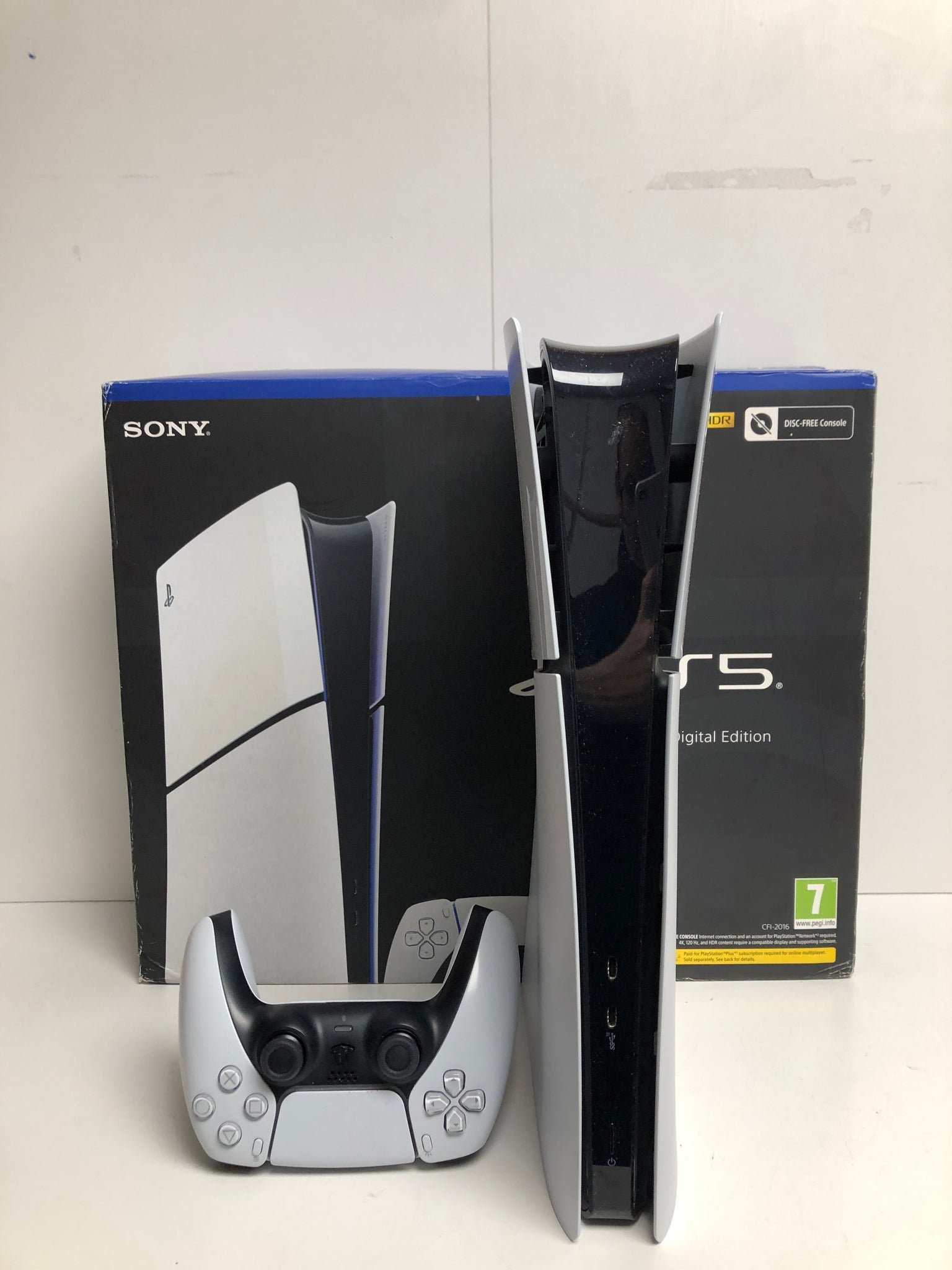 The PlayStation 5 Console Digital Edition Slim (NO DISC) is a cutting-edge gaming console that redefines your gaming experience. Dive into a world of immersive gaming with lightning-fast loading times made possible by its ultra-high-speed SSD. This next-generation console delivers unparalleled immersion with features like haptic feedback, adaptive triggers, and 3D audio. Experience the power of the PS5's next-generation graphics and breathtaking visual fidelity, rendering your games in stunning detail. As the all-digital version of the PS5 console, it doesn't have a disc drive. However, you can easily download and access an expansive library of digital games from the PlayStation Store. This sleek, streamlined version offers all the power and features of the standard PS5 without the physical disc capabilities. The Digital Edition offers the same impressive features as its counterpart but is a lighter, more streamlined console, perfect for those who prefer digital game downloads. Whether you're a seasoned gamer or just starting, the PlayStation 5 Console Digital Edition Slim is sure to deliver a gaming experience you'll never forget.