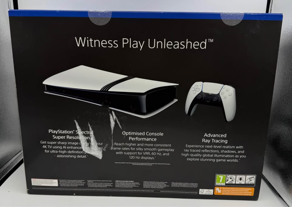 With the PlayStation®5 Pro console, the world’s greatest game creators can enhance their games with incredible features like advanced ray tracing, super sharp image clarity for your 4K TV, and high frame rate gameplay*. That means you get to play PS5® games with the most impressive visuals ever possible on a PlayStation® console. PS5® Pro is an all-digital console with no disc drive. Sign into your account for PlayStation™Network and go to PlayStation™Store to buy and download games**. You can also add a Disc Drive*** to your PS5® Pro console if you would like to play PS5 or PS4 games on Blu-ray™ Disc, or if you want to watch movies and shows on 4K Ultra HD Blu-ray™ Discs, Blu-ray™ Discs, and DVDs. What's In The Box PlayStation®5 Pro Console DualSense® Wireless Controller 2TB SSD (solid-state drive) 2 plastic stand feet to place the console horizontally HDMI® cable AC power cord User manual ASTRO's PLAYROOM (Pre-installed game)**** Features PlayStation® Spectral Super Resolution Optimised Console Performance Advanced Ray Tracing 2 TB of built in storage. Smooth and fluid high frame rate gameplay at up to 120fps with 4K output and Ray. PS5® Pro game boost and backwards compatibility***** Enhanced image quality for PS4 games. Next level online wireless connectivity. Ultra-high speed SSD for maximum game-play. Ray tracing simulating light and shadows. 4K TV ready gaming. HDR technology displaying vibrant and lifelike colours. Tempest 3D AudioTech make your surroundings come alive. Haptic feedback through the DualSense® wireless controller in select PS5® games. Adaptive triggers which simulate the physical impact of in-game activities in select PS5® games. Get started right away with the included ASTRO'S Playroom pre-installed game. Integrated I/O. **BRAND NEW SEALED OPENED ONLY TO CHECK CONTENTS NEVER USED**