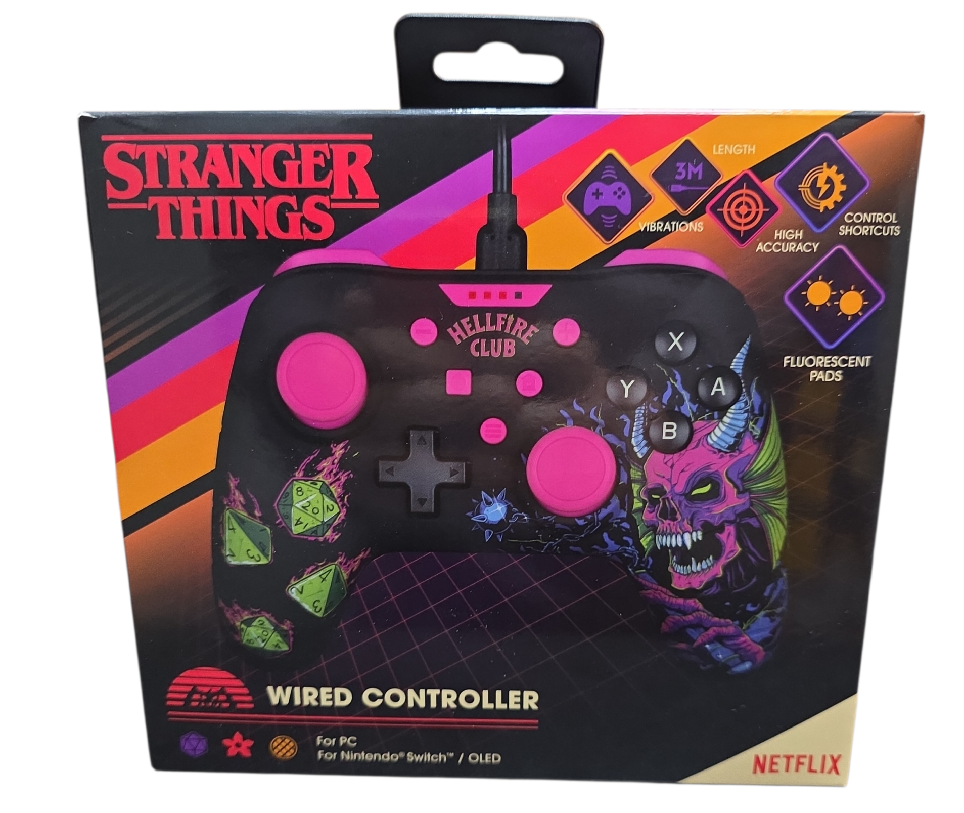 Experience the thrill of the 80s and embark on an adventure in the strange world with the Stranger Things Nintendo Switch Controller. A controller for the greatest of Stranger Things Fans. With a 3-metre cable, you enjoy complete freedom of movement without compromise. The two high-precision 3D analog sticks offer precise and responsive control, enabling full immersion. The ergonomic grip of the controller ensures optimal comfort, even during long gaming sessions.