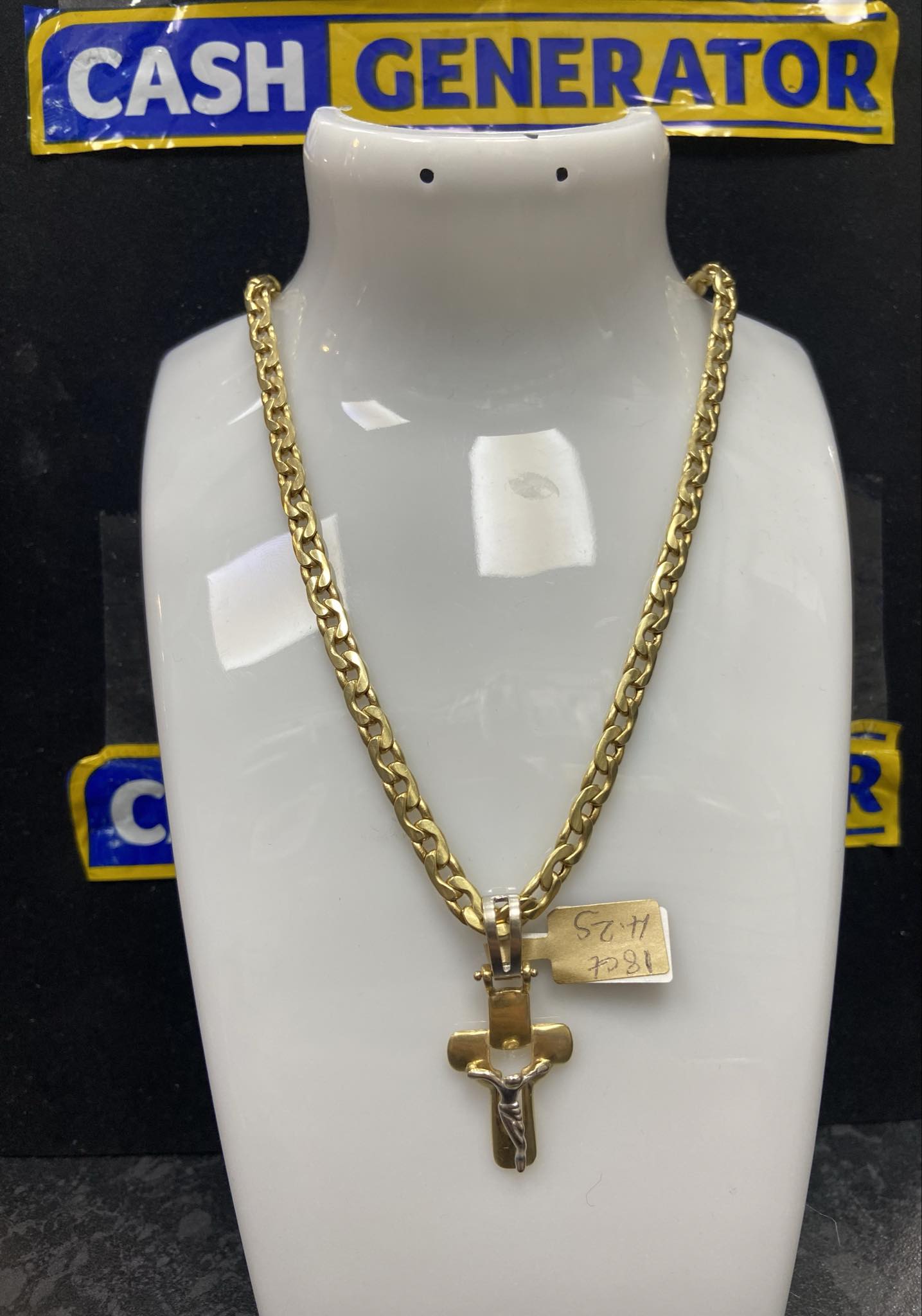 An 18ct gold fancy link chain and crucifix pendant that weighs 22.0g and is 20 inches long. Chain and pendant in fantastic condition.