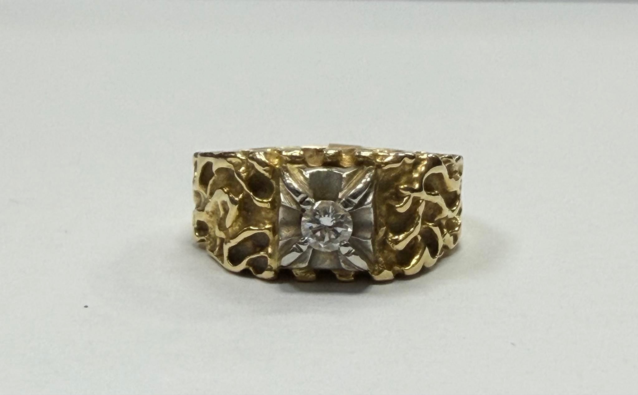 An 18ct gold ring with a CZ stone in the centre that weighs 10.275 grams in a size T. The ring is in great condition with minor signs of wear. The ring has been professionally cleaned and polished. The ring is hallmarked and tested. Boxed - Delivery or Collection **Click and Collect from the Handsworth Branch**
