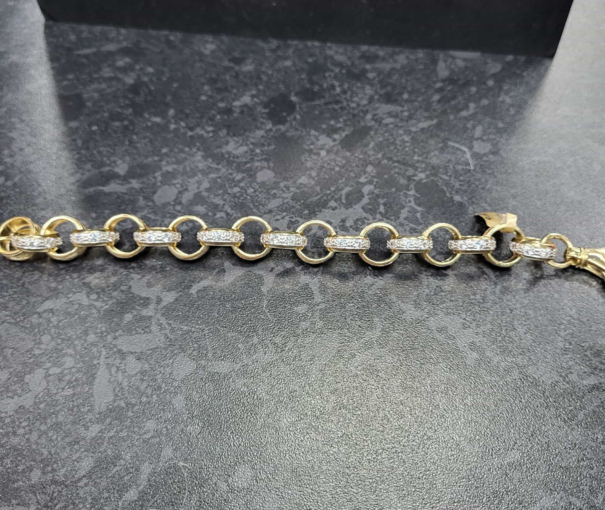 A 9ct gold c/z belcher bracelet that weighs 36.01g. Bracelet is in pristine condition, cleaned and polished.