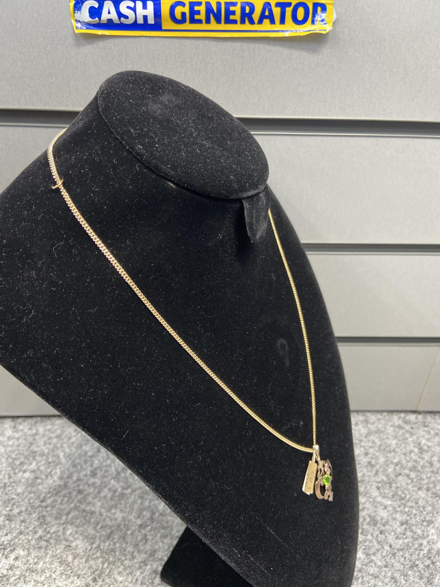 A 9ct gold fine curb chain and fancy green stone pendant, that weigh 8.4g in total and is 22 inches long. Chain and pendant are in pristine condition, cleaned and polished.