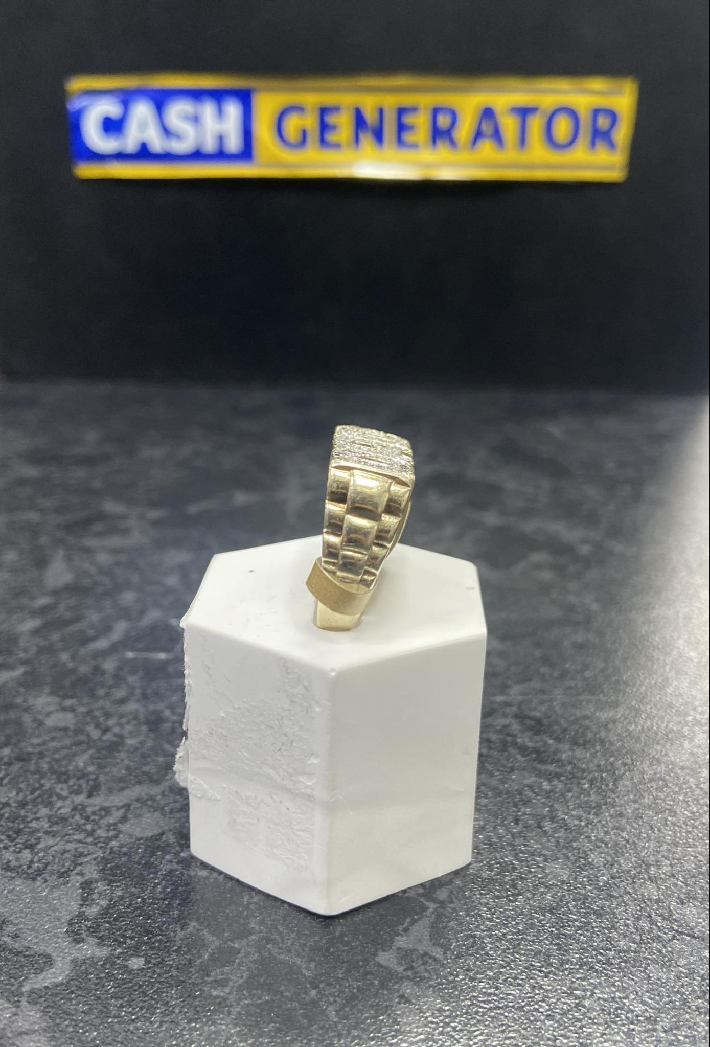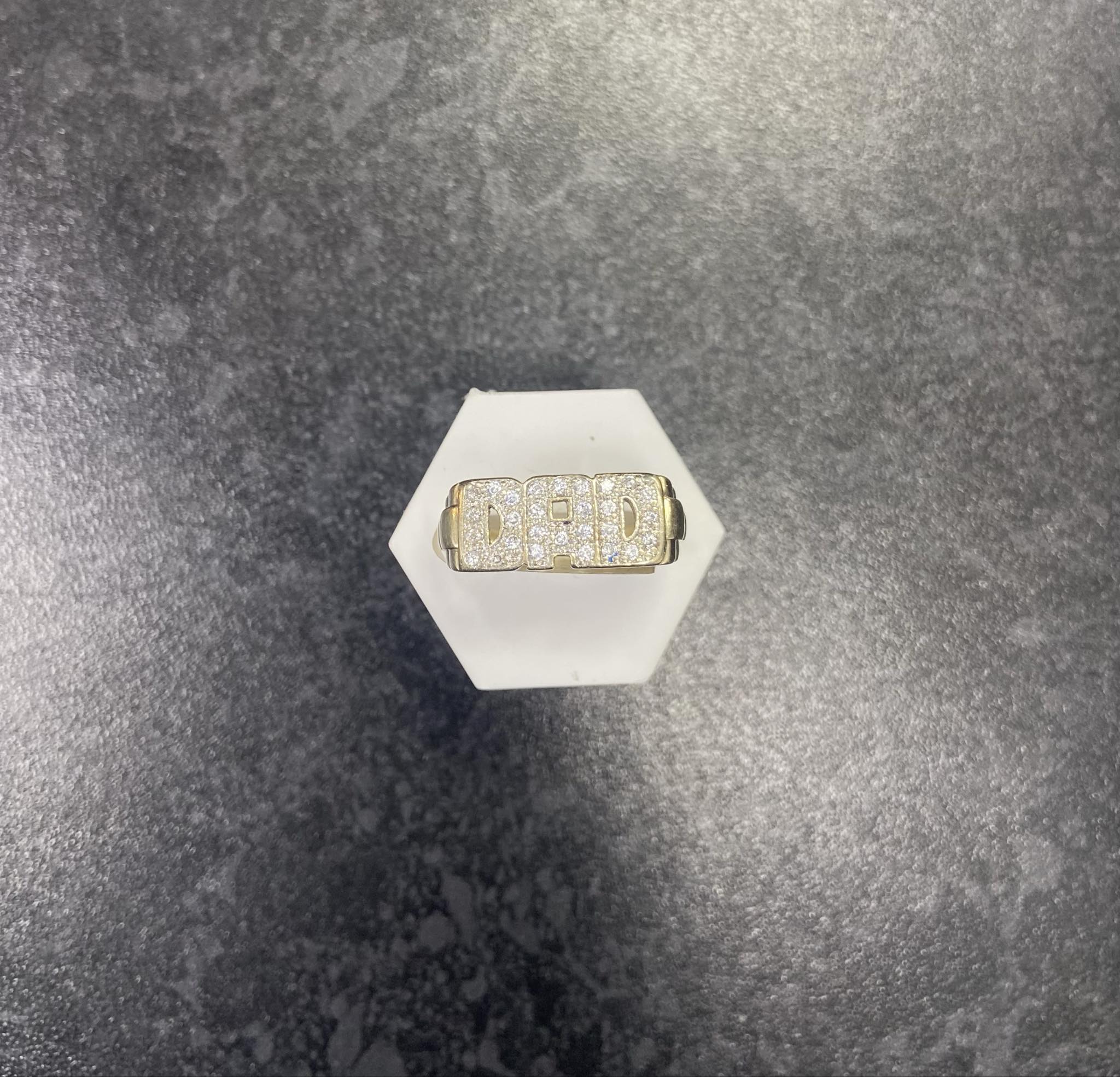 A 9ct gold gents c/z 'DAD' ring that weighs 5.8g and is size T. Ring is in pristine condition, cleaned and polished.