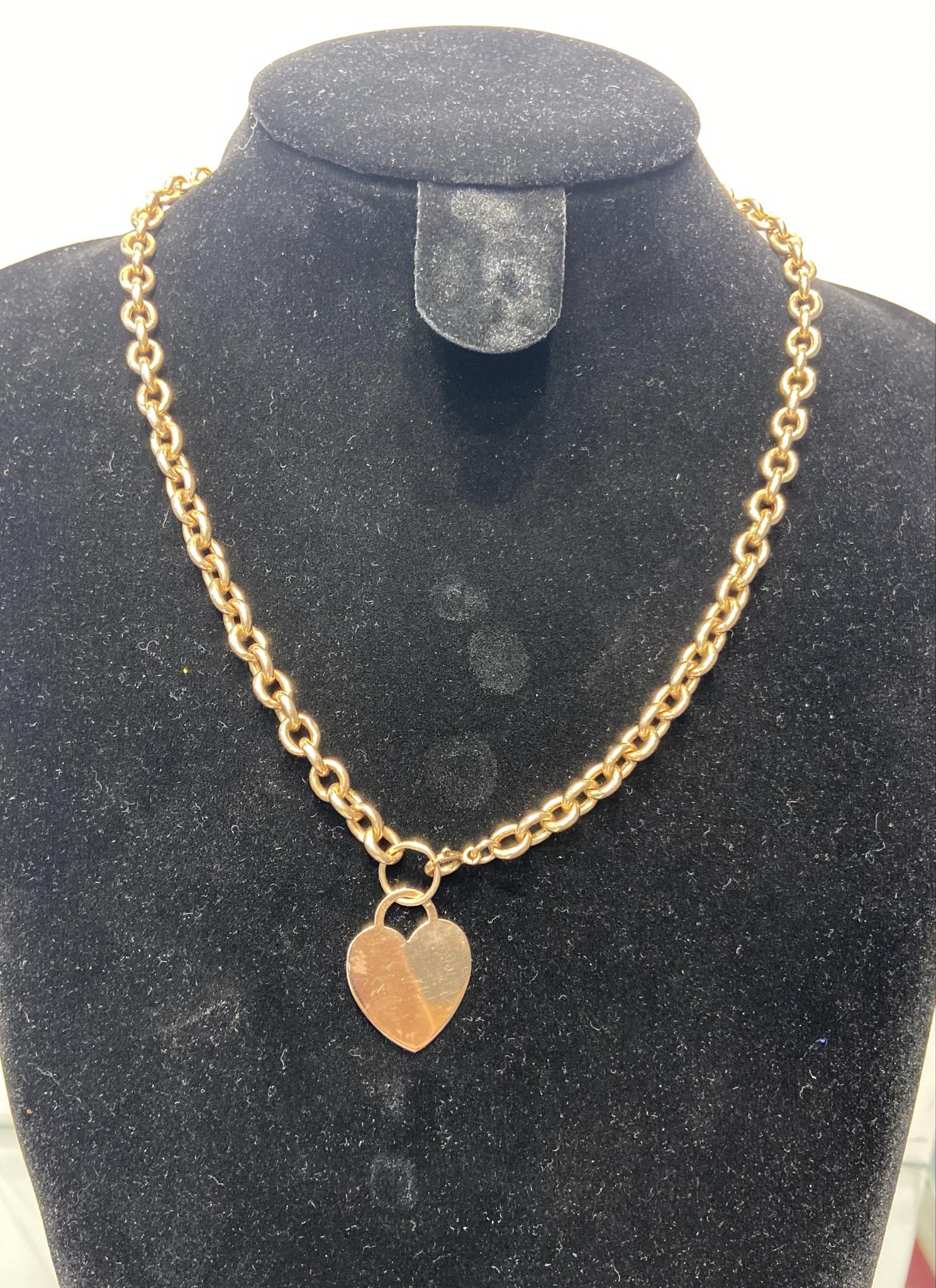A 9ct rose gold heart necklace that weighs 21.3g and is 18 inches long. Necklace is in very good condition.