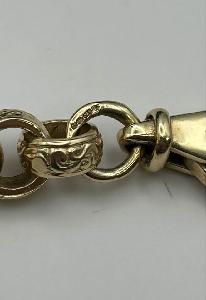 9K 375 HALLMARKED YELLOW GOLD, ENGRAVED BELCHER BRACELET, 9” 34.4G ITEM IS IN WEARABLE CONDTION, FULLY HALLMARKED PLEASE USE PHOTOS AS REFERENCE
