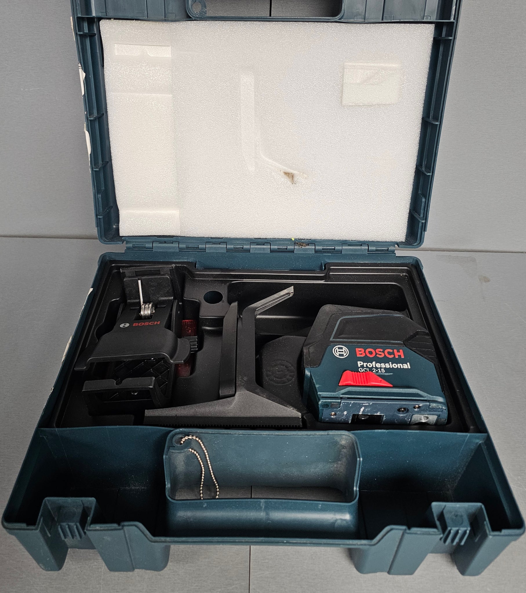 Bosch GCL 2-15 Self-Levelling Cross Line Combi Laser with BM3 Universal Mount, RM1 Wall Mount, Protective Bag, Laser Target Card and AA Batteries 0601066E02 The compact and versatile Self-Levelling GCL 2-15 Professional Combi Laser from Bosch is now available for use in all levelling applications at distances of up to 15 m. Tradespeople can use the tool to project both a horizontal and a vertical laser line as well as two centred plumb points for transfer applications on the floor and ceiling. The highly visible laser lines can be easily and precisely aligned in a 360° circumference around the fixed plumb points – without having to re-position the tool. This is made possible by the RM 1 Professional rotating multi-functional mount, which enables users to secure the tool in a wide variety of places on the floor, wall or ceiling. The mount consists of an angle bracket with feet containing strong magnets, enabling the tool to be secured to iron girders or other magnetic structural elements. The Bosch GCL 2-15 Professional fits easily and securely into this mount. If the combi laser is placed on the floor within this mount, the plumb point projected downwards is always easily visible thanks to the elevated position of the tool. Furthermore, the RM 1 Professional can also be quickly and easily secured to existing profile sections or components using a clamp, for example to align air ducts or suspended ceilings during construction.