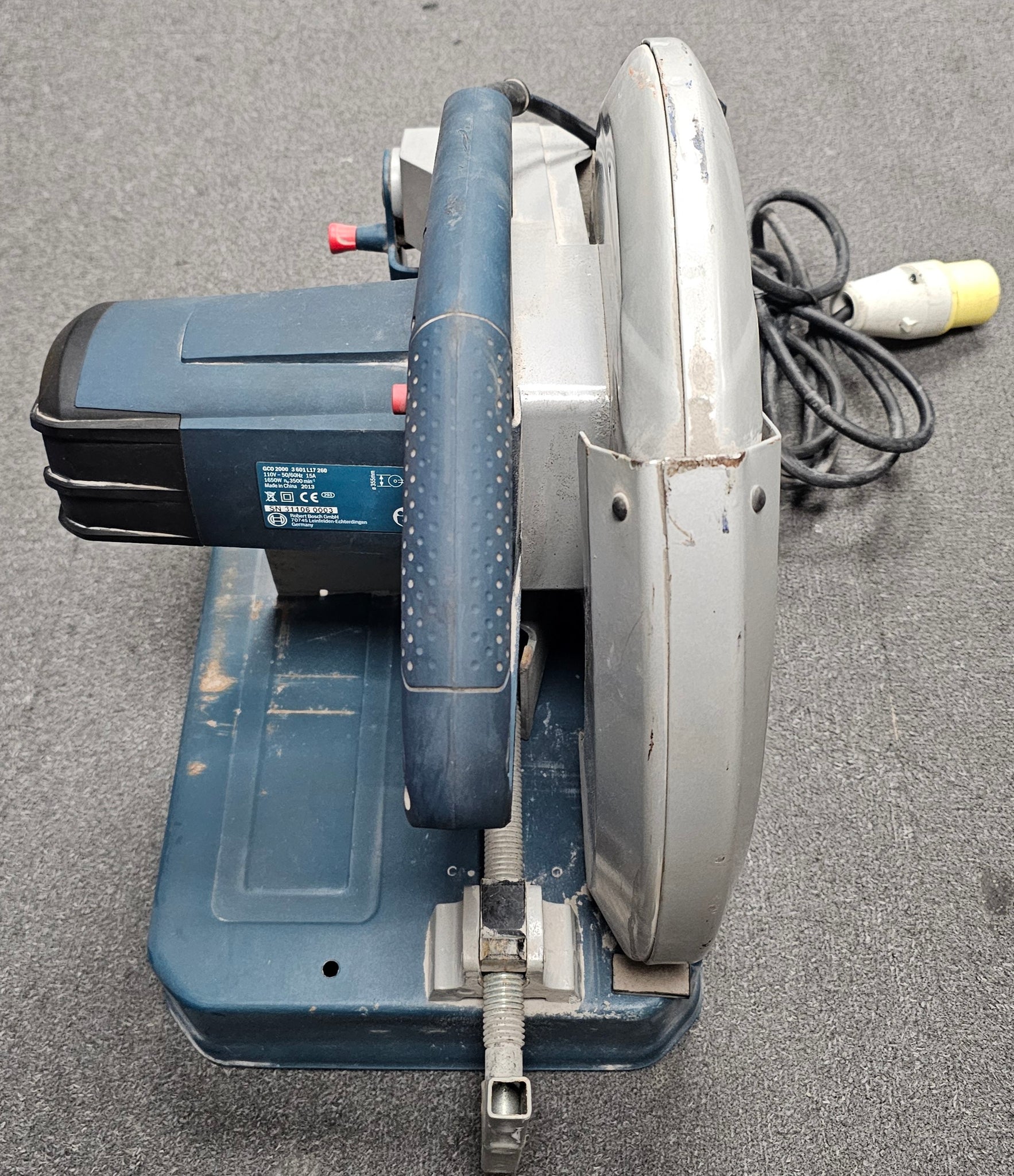 Bosch GCO 2000 Professional Heavy Duty Metal Cut-Off Grinder Saw The robust tool for the toughest applications FEATURES Extremely robust lever and spring construction for the highest work loads Powerful 2000 W motor with starting current limitation for fast work progress Tried-and-tested Bosch angle grinder motor provides superior product lifetime User-friendly quick clamping mechanism with continuously variable mitre angle setting up to 45° Vertical D-handle for ergonomic working Integrated handle for easy transport SPECIFICATION Cutting capacity at rectangle 0º: 180 x 85 mm Cutting capacity at square 0º: 110 x 110 mm Cutting capacity at L-profile 0º: 130 x 130 mm No-load speed: 3,500 rpm Cutting disc diameter: 355 mm Cutting disc bore: 25.4 mm Weight: 18.0 kg