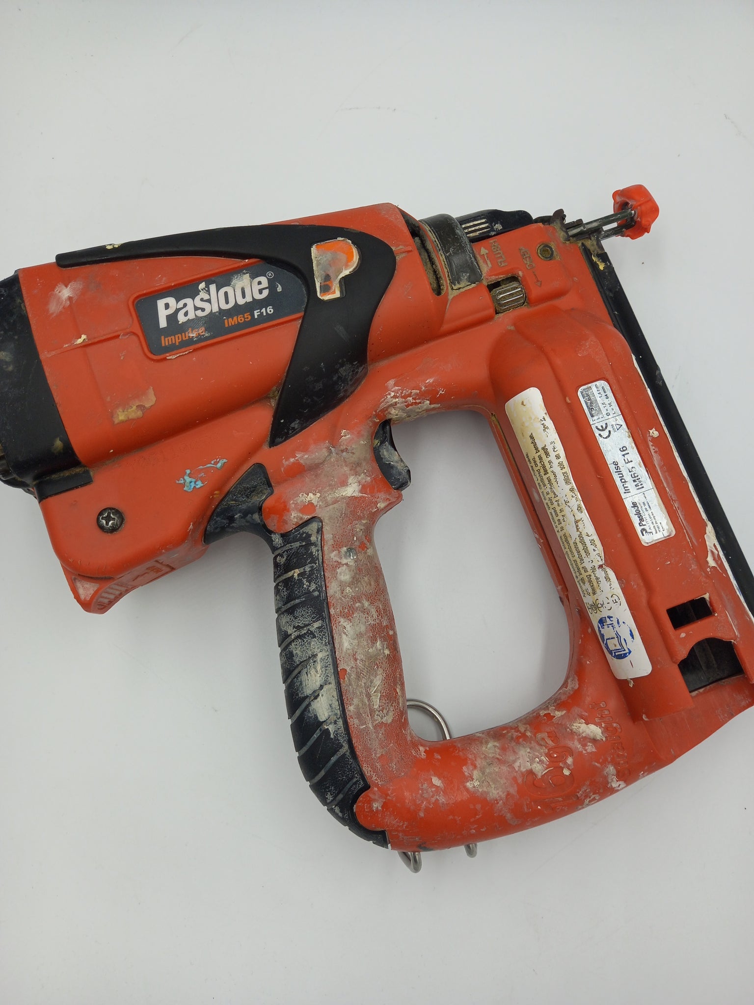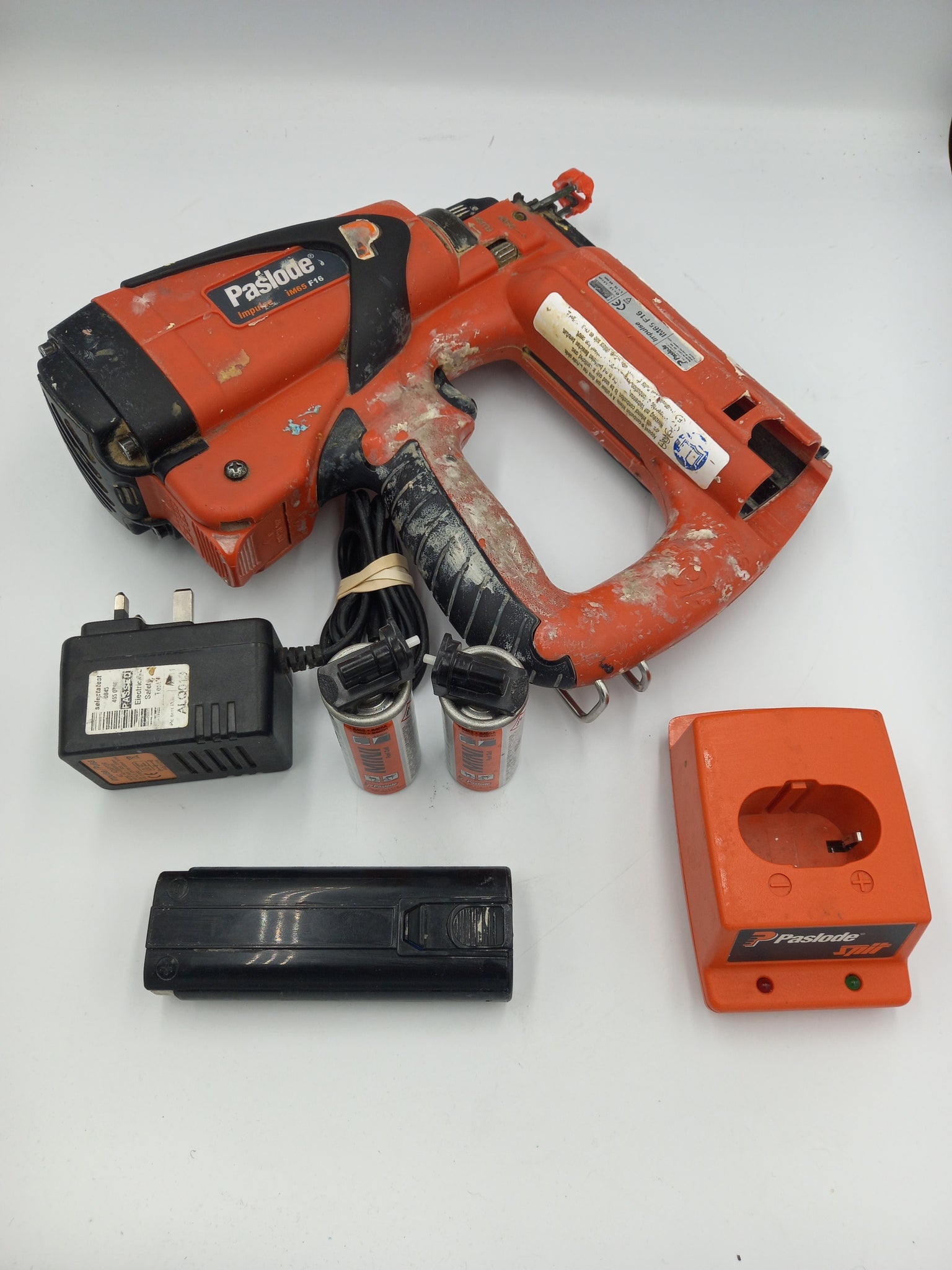 Paslode IM65 F16 Nailer Nail Gun Second Fix, with 1x 13.2Wh 6V Battery & Official Charger Extra Gas Canisters (Used, not full)