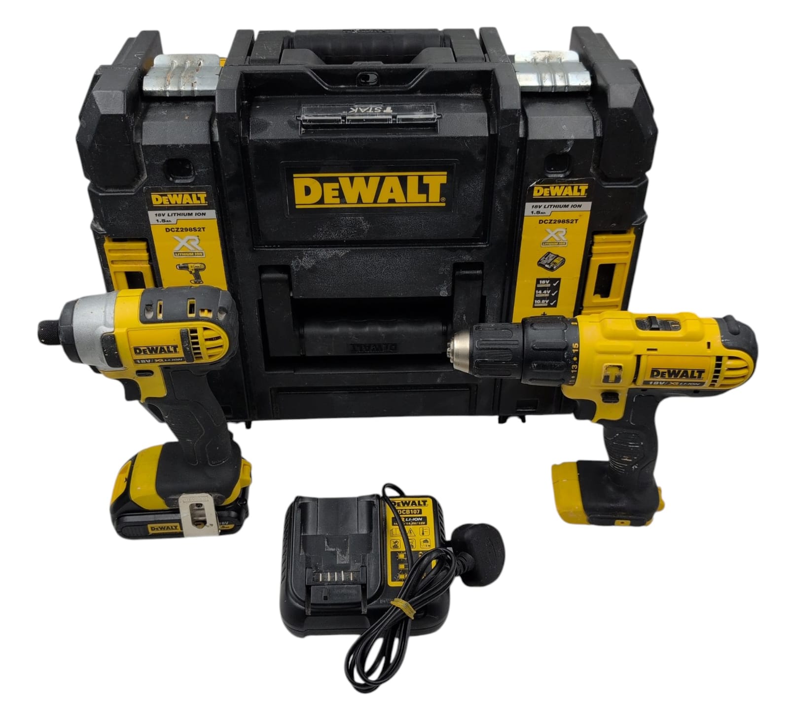 DeWalt 18 Volts Impact and Combi Drill Set with One 1.5AH Battery, Charger and Hard Carry Case. Drills and battery are in good condition, does have scratching and marks, used. Collection and delivery available.
