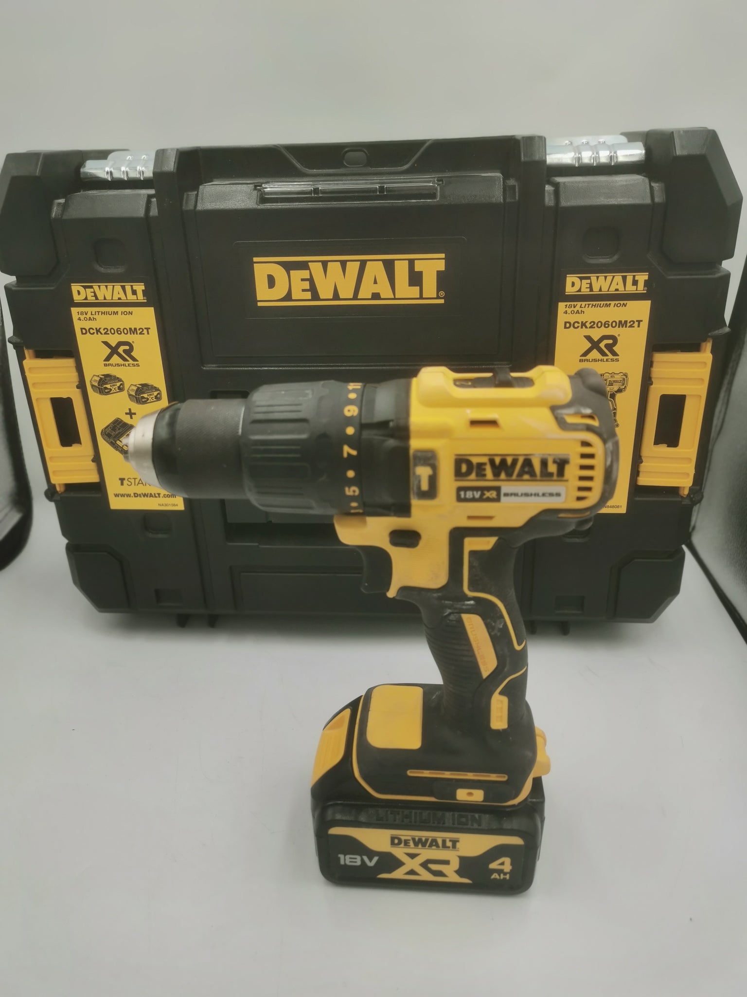 Versatile DeWalt DCK2060M2T-SFGB 18V twin pack containing combi drill and impact driver to deliver reliable cordless performance with brushless motor technology. The combi drill provides 65Nm max torque, and features 15-position clutch which includes screwdriving, drill driving and hammer settings for a wide range of applications, and the compact, lightweight impact driver delivers 170Nm—ideal for high-torque fixings in tight spaces. Both tools feature all-metal gearboxes with aluminium front housing, offering heat dispersion for increased durability and bright white LED work lights to improve visibility. Drop-in keyless hex driver allows for quick, one-handed fitment. Supplied with 2 x 4.0Ah XR Li-Ion batteries, a 100-minute multi-voltage charger, and a stackable TSTAK case for easy site transport
