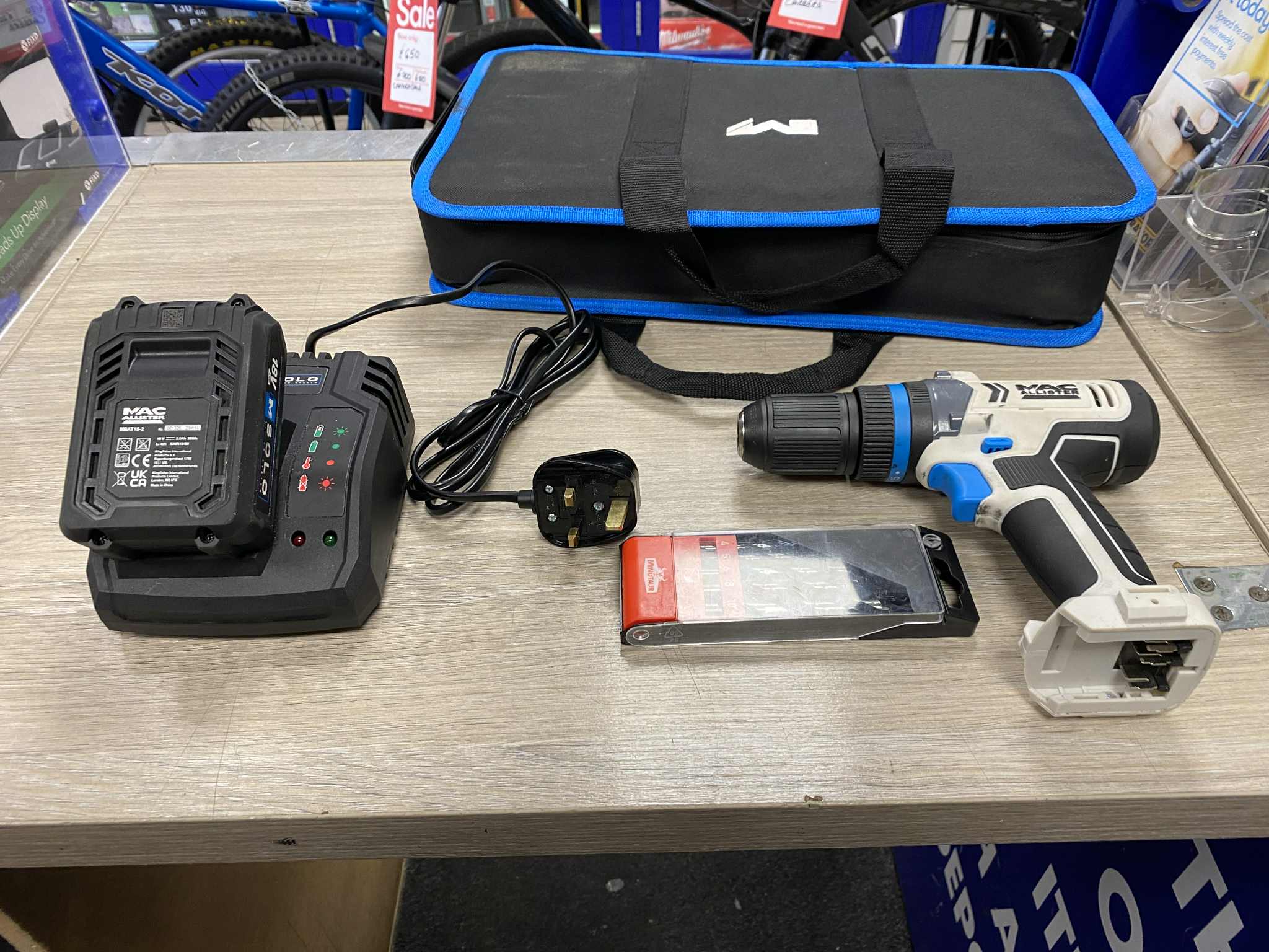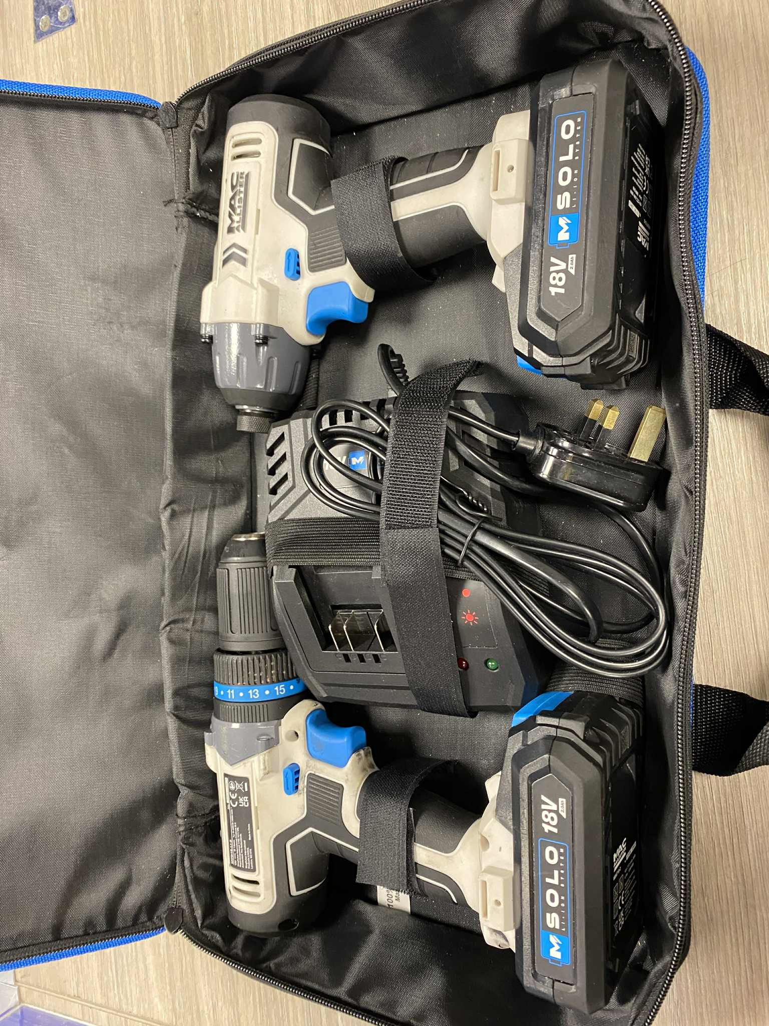 Mac Allister cordless drill & impact driver combi Includes 1x battery charger Includes 1x combi drill; 21 torque settings Includes 1x impact driver; 100NM; 6.35 chuck Includes 2x 2.0AH batteries Includes 1x charger Includes 1x minotaur 4/5/6/8/10mm bit set
