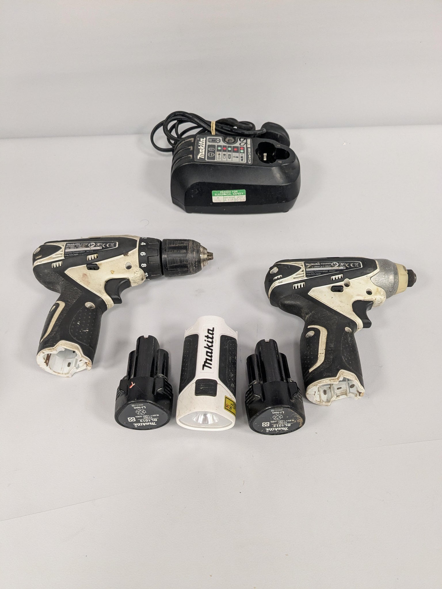 In good condition with 2x batteries, charger & Makita ML100 LED torch attachment