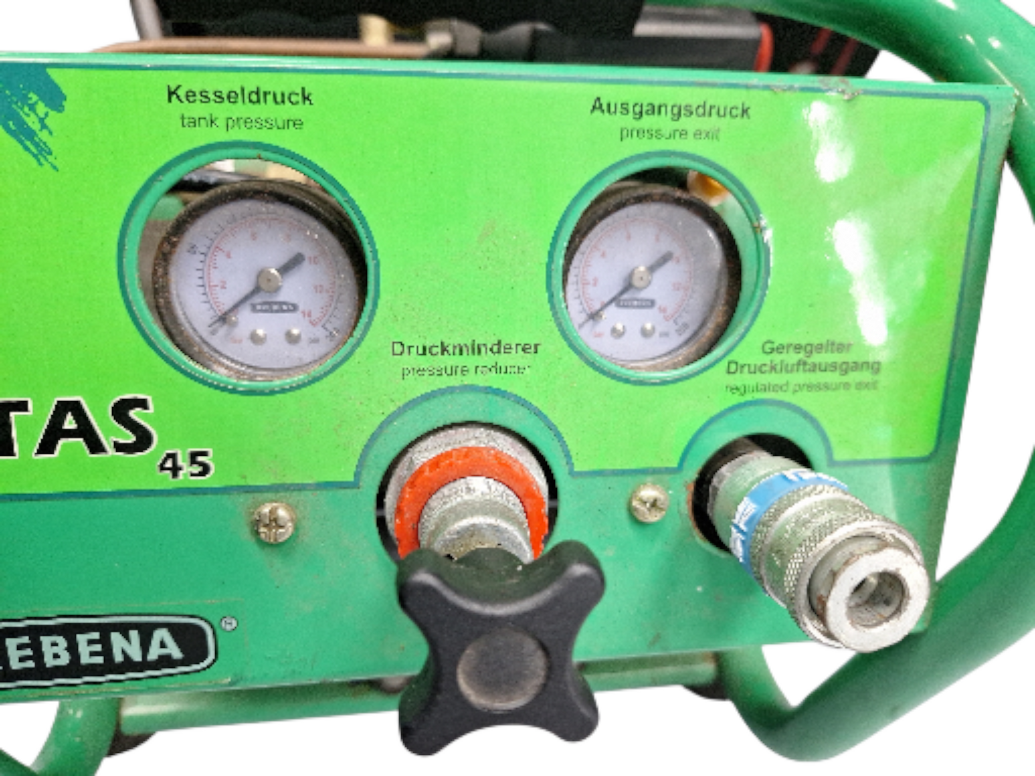 The PREBENA VITAS 45 is a compact, oil-free, 4L air compressor designed for mobile and DIY/hobby use, featuring a 10 bar max pressure, 250W motor, 24 l/min output, and weighing only 10kg, with features like pressure gauges, a reducer, and a comfortable handle for portability and easy operation. Key Specifications: Tank Capacity: 4 Litres (0.88 Gallons) Max Pressure: 10 bar (145 psi) Power: 230V / 250W Air Flow (Effective): 24 l/min Suction Power (Inlet): 41 l/min Rotational Speed: 2840 RPM Weight: 10 kg (22 lbs) Dimensions (L x W x H): 370 x 310 x 300 mm (14.57 x 12.20 x 11.81 in) Noise Level (LpA): 72 dB(A) Features: Oil-Free: No oil changes, no oil in condensation. Portable: Lightweight (10kg) with a non-slip coated handle. User-Friendly: Pressure gauge for tank, pressure gauge with reducer for regulated output. Durable: Robust construction with solid rubber feet for stability. Applications: Ideal for driving small pneumatic tools (like nailers) and inflation tasks.