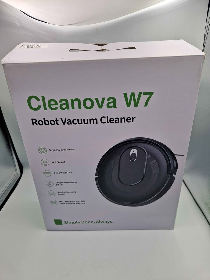 4500Pa strong suction, 2-in-1 robot vacuum and mop, 55dB low noise, 250ml dust bin, variety of intelligent cleaning modes, App/Remote/Voice Control4500Pa strong suction, 2-in-1 robot vacuum and mop, 55dB low noise, 250ml dust bin, variety of… See more Colour Black Product dimensions 30.6L x 30.6W x 7.4H centimetres 【2 in 1 4500Pa Robot Vacuum Cleaner with Mop】W7 2-in-1 robot vacuum and mop features an impressive 4500Pa suction power thanks to its innovative Hyper Motor design. Perfect for both hard floors and low-pile carpets. It comes with a 250ml dust bin and a 230ml water tank, effectively tackling stains and spills. You can also adjust the mop pad's dampness with three different water flow settings for tailored cleaning. 【Long Runtime & Automatic Charging】With a powerful 2600mAh Li-ion battery, W7 robot vacuum offers an impressive cleaning time of up to 120 minutes in auto mode, ensuring thorough cleaning without interruptions. With the ability to cover approximately 1200 sqft, it efficiently handles large areas. When the battery drops below 15% or the cleaning is complete, the vacuum intelligently returns to its charging dock for automatic recharging. 【Slim and Quiet】With a height of only 2.89 inches, W7 robot vacuum cleaner is engineered for compactness. Its 360-degree universal wheel enables effortless movement, ensuring thorough cleaning in tight spaces such as beneath beds, sofas, and cabinets. At a quiet 55dB in silent mode, it creates a serene environment, allowing you to focus on your tasks without any noise disruptions. 【APP/Remote/Alexa Control】W7 robot vacuum cleaner is compatible with Alexa, Siri, IFTTT, and Google Assistant, enabling users to initiate and stop cleaning with simple voice commands. You can easily schedule cleaning sessions from anywhere, choosing the start time and mode through the dedicated app. (Note: W7 robot only supports 2.4GHz Wi-Fi.) 【How to connect W7 Cleanova Robot?】1.Download the app from the google store 2. Click "Add device" and open your Bluetooth 3.Make sure the robot is turned on and press and hold the two buttons for 5 seconds 4. The APP automatically detects the W7 robot vacuum and into the connection page 5.Please ensure connection to the 2.4Ghz WiFi 6. Wait for the robot to pair successfully