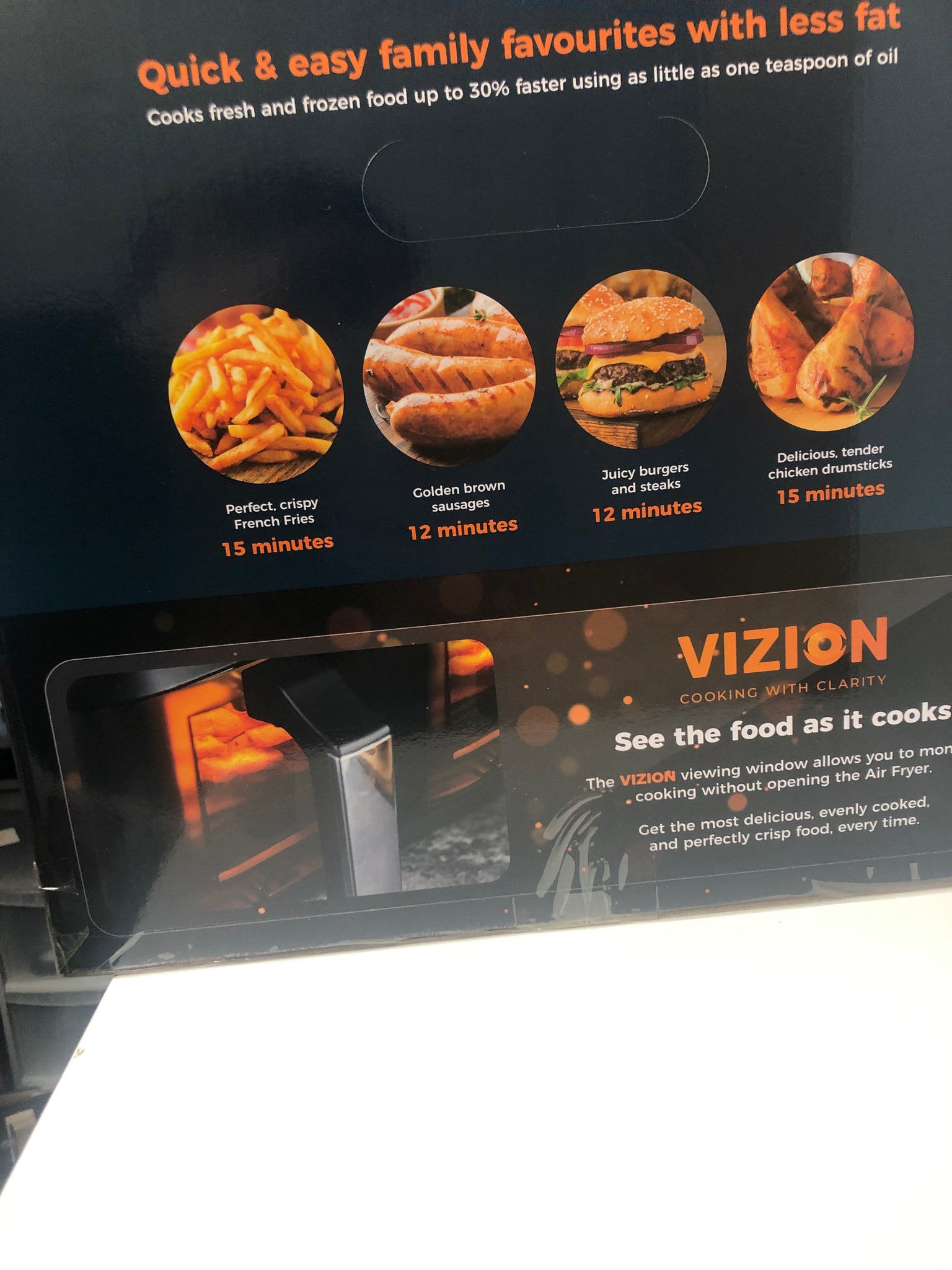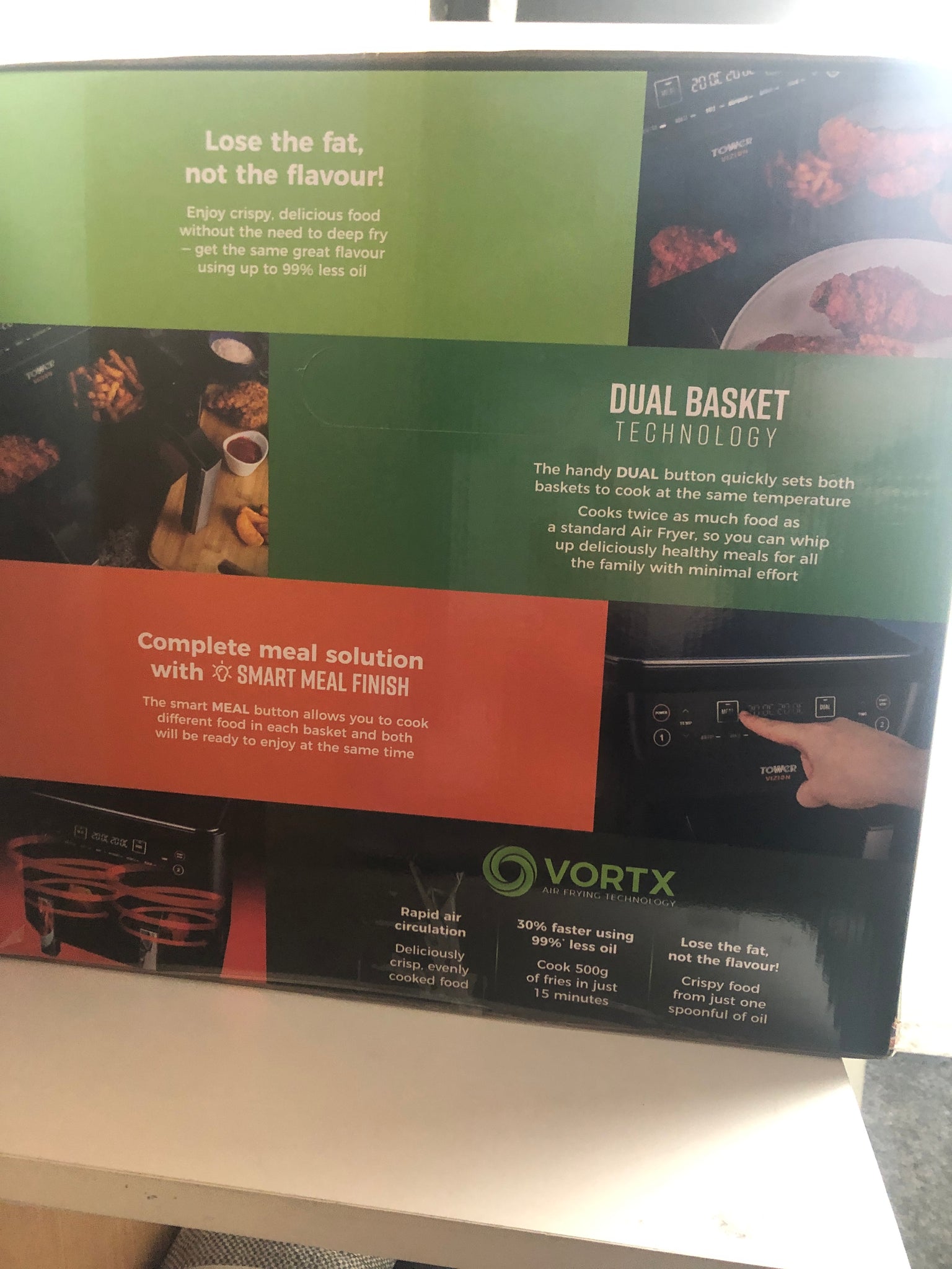 You can cook a range of delicious recipes with this 8L Dual Basket air fryer, while slashing your energy use by up to 50% compared to a conventional oven. It also uses rapid air circulation technology to cook food 30% faster and with 99% less fat from just one spoonful of oil. With Vortx frying, you lose the fat, not the flavour, cooking your ingredients with extra-crispiness and the same delicious fried taste. It can cook chips that are crispy and golden on the outside but still fluffy on the inside in just 15 minutes. With 6 Pre-set cooking functions (air fry, roast, bake, dehydrate, defrost and reheat), you can create a fantastic choice of deliciously healthy meals for all the family with minimal effort. The 2x 4L baskets can be used in tandem or separately, including their own separate timers. The digital touch panel is easy to use and over-heat safety protection provides peace of mind. boxed, new unused item.