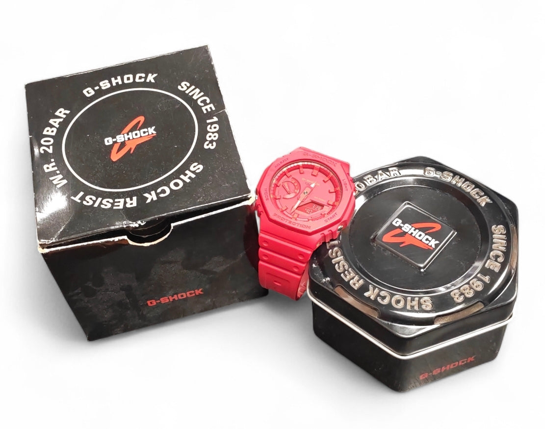 Stylish- Sporty and a modern design, very suitable for Men -The watch has a calendar function: Day-Date, Stop Watch, Worldtime, Timer, Alarm, Light High quality 21 cm length, 22 mm wide, Red Plastic strap with a Buckle Case diameter: 43 mm, Case height: 11 mm and Case color: Red Dial color: Red Water resistant: 20 bars- Weight: 50 grams The watch is delivered in an original gift box