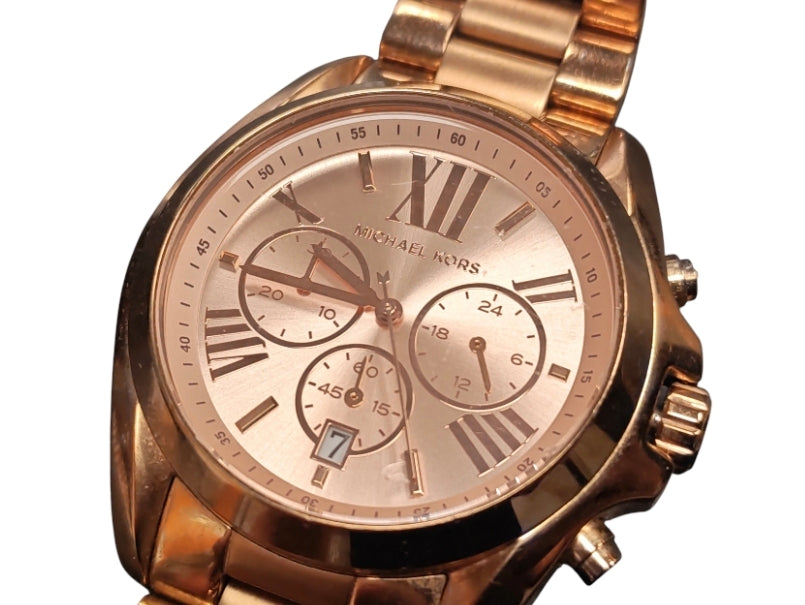 The Michael Kors MK5503 is a popular rose gold-tone chronograph watch from the Bradshaw collection. It features a oversized, boyfriend-style aesthetic with classic Roman numeral markers and a stainless steel bracelet
