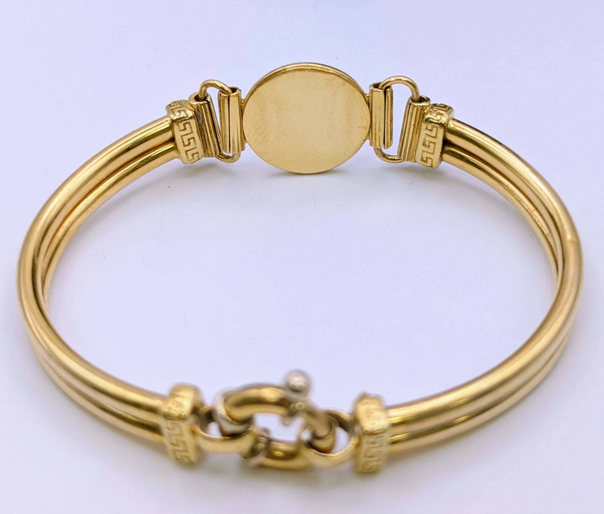 750 HALLMARKED 18CT, YELLOW GOLD VERSACE BANGLE, 6", 21.6G, BOXED Bangle is free of any serious warping to its original shape, however as it is a pre owned item some signs Harpurhey Store