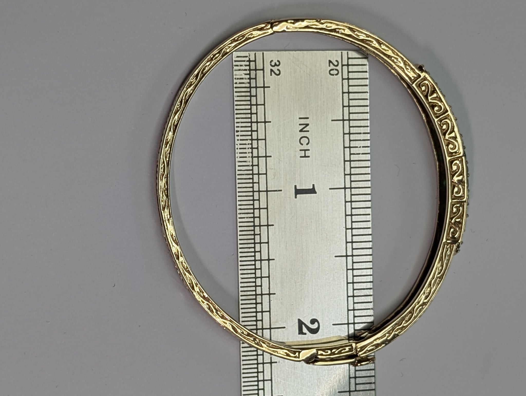 HERE WE HAVE A 9CT GOLD DIAMOND & EMERALD PATTERNED BANGLE. THIS WEIGHS 15.61G WITH WIDTH SIZE SHOWN. ** FOR ANY QUERIES PLEASE CALL OUR PRESTON STORE DIRECT MON-SAT 01772 204899