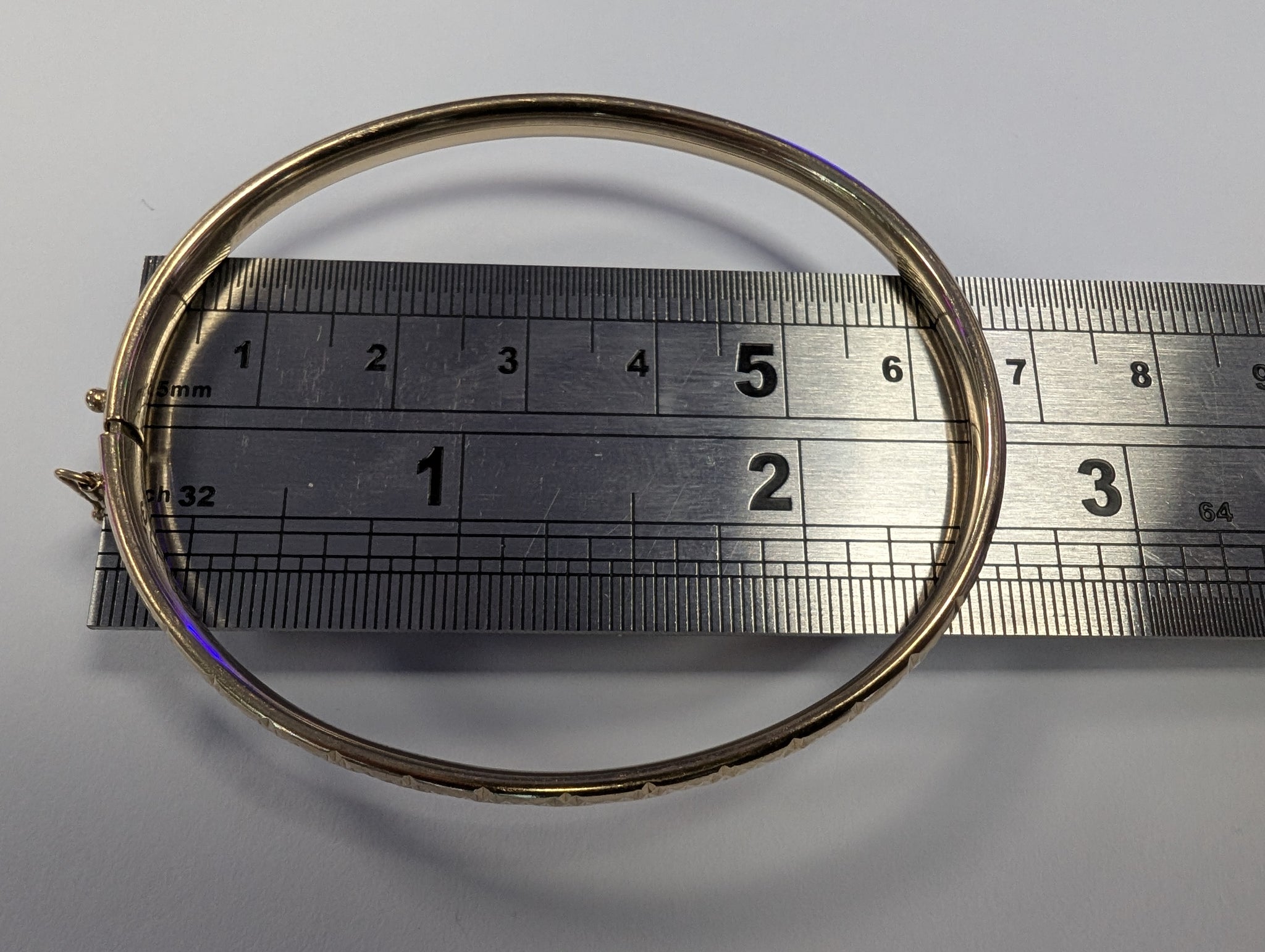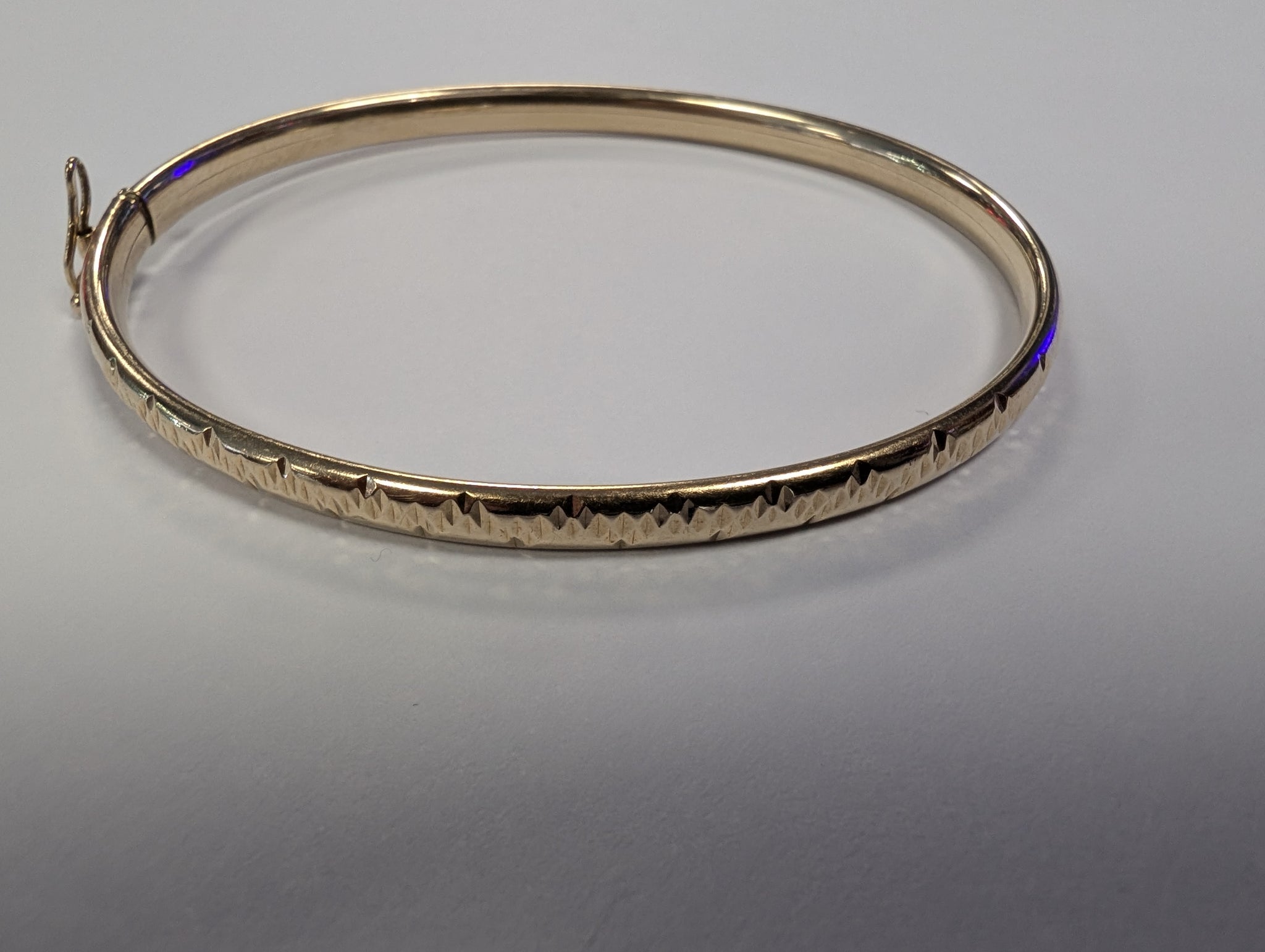 HERE WE HAVE A 9CT GOLD PATTERNED BANGLE. THIS IS HALLMARKED 375 AND WEIGHS 4.90G. **** FOR ANY QUERIES PLEASE CALL OUR CHORLEY STORE DIRECT MON-SAT 01257 752333
