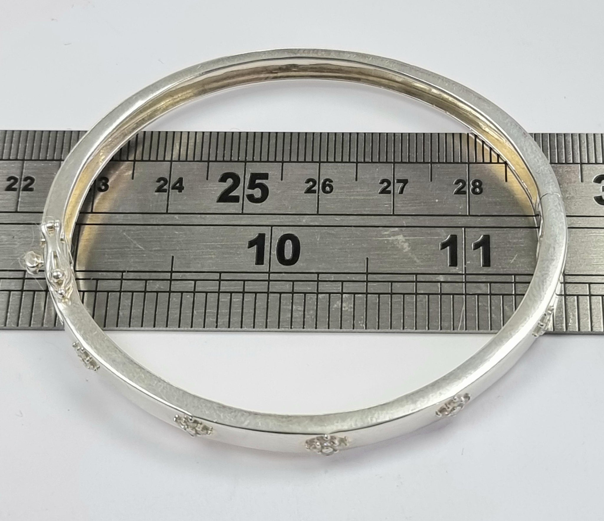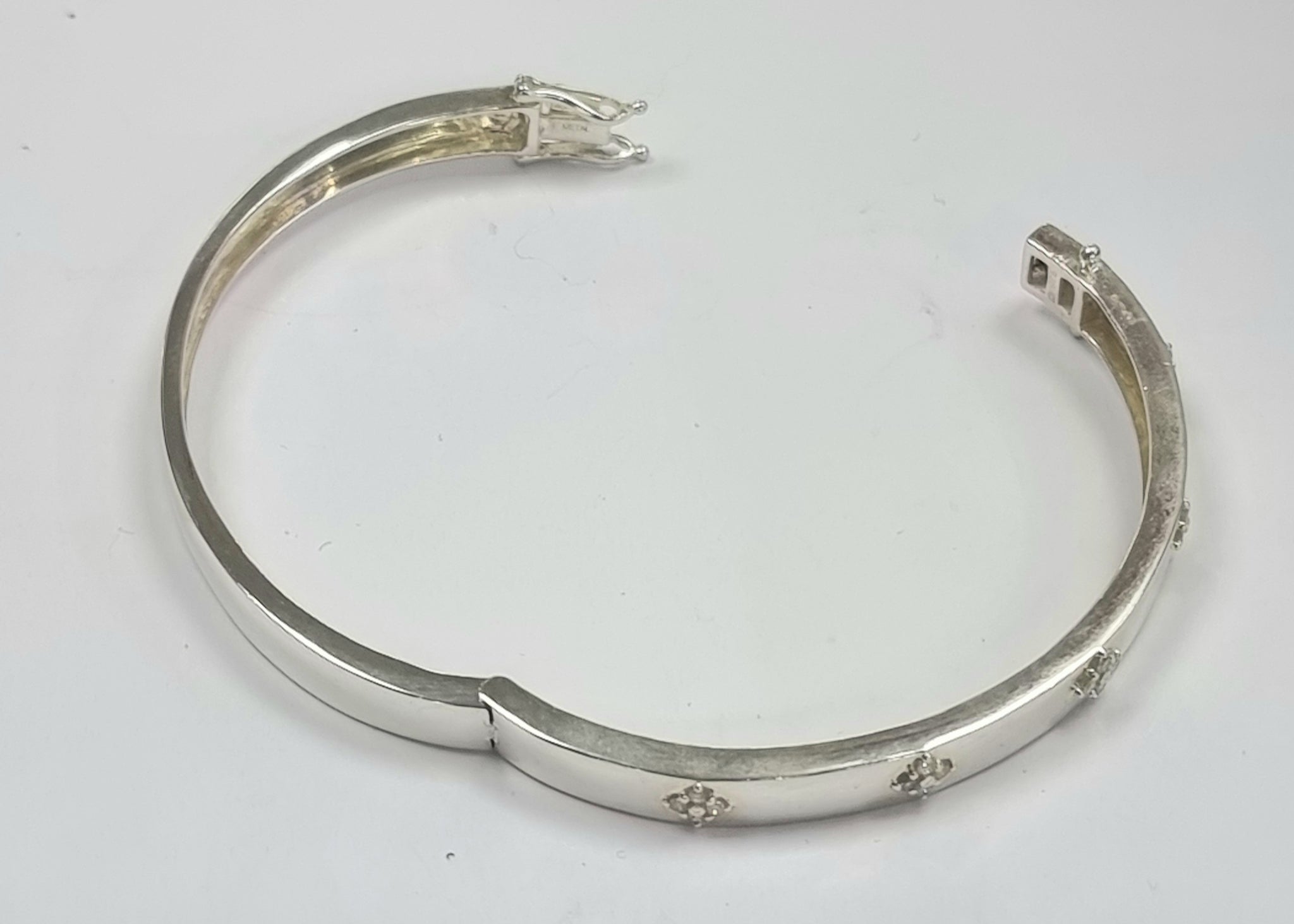A stunning silver bangle that opens with 5 sets of moissanite stones and a solid catch. This weighs 14.90 grams