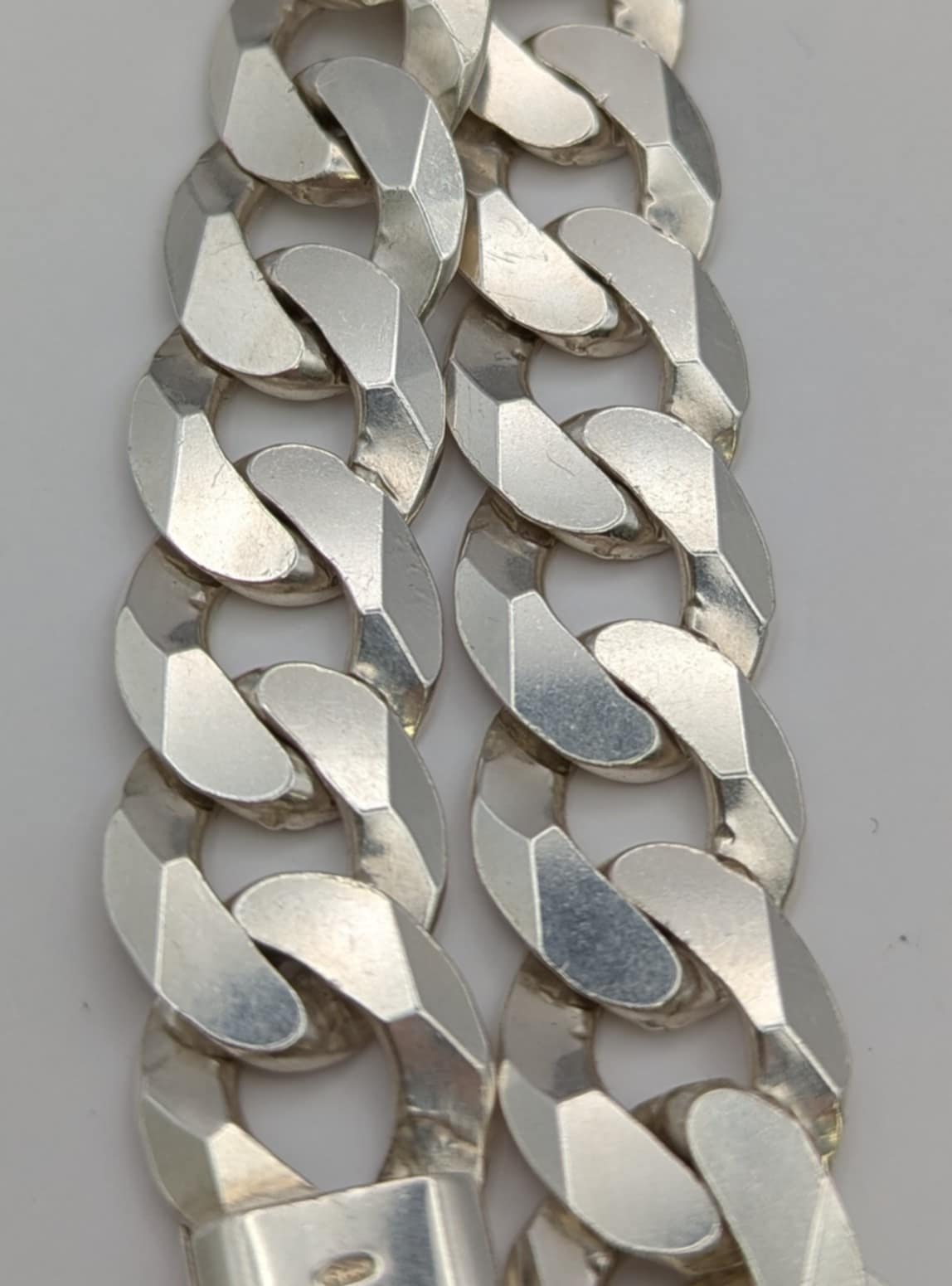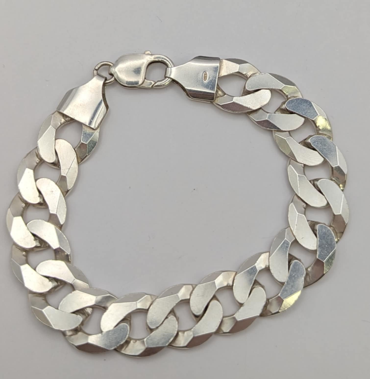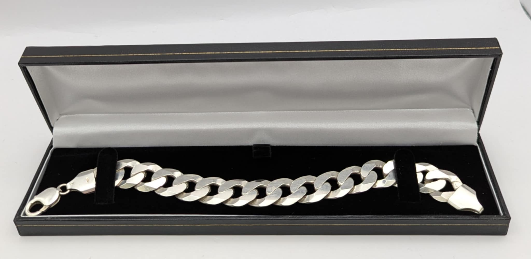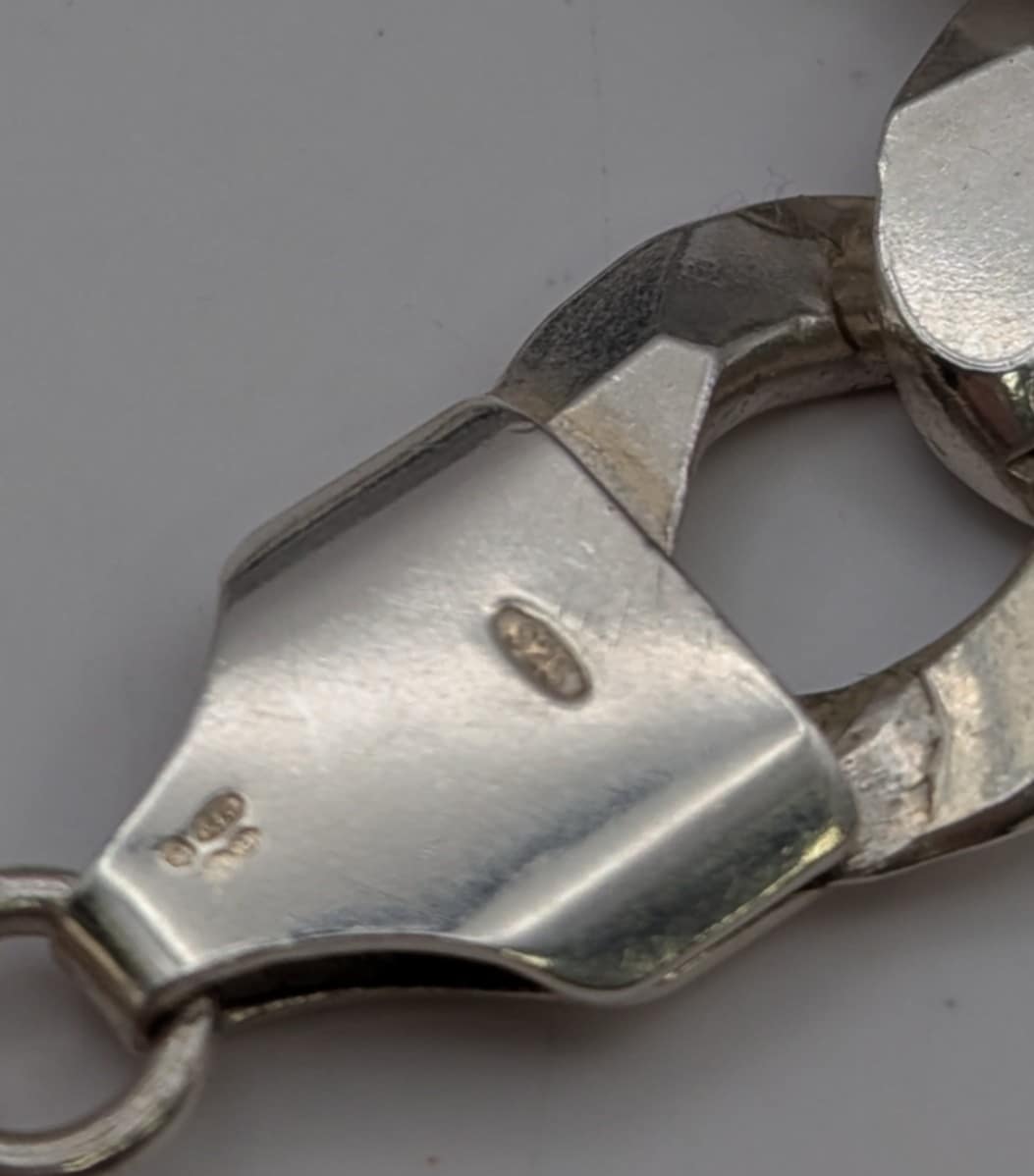 925 SILVER HALLMARKED, THICK CURBED CHAIN WITH LOBSTER LOCK, 8", 44.66G, BOXED IT IS IN A WEARABLE CONDITION AND IS FREE FROM ANY MAJOR WARPING, HOWEVER AS IT IS A PRE OWNED GOOD SOME SIGNS OF USE MAYBE VISABLE, THIS COULD INCLUDE LIGHT SCRATCHS, PLEASE SEE PHOTOS HARPURHEY STORE