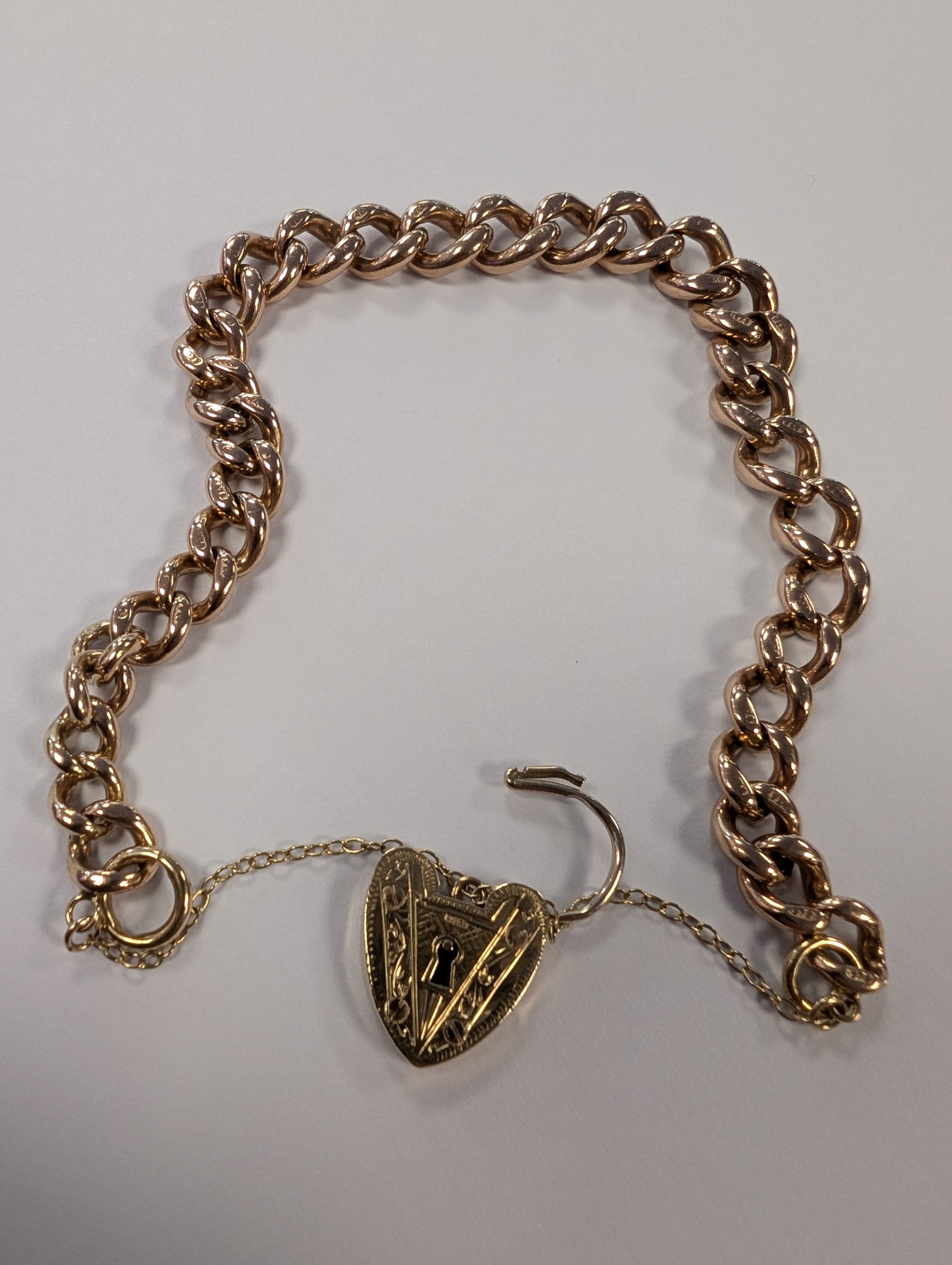 HERE WE HAVE A 9CT GOLD ROSE CHARM BRACELET WITH HEART LOCK & SAFETY CHAIN. THE BRACELET WEIGHS 24.53G AND IS MARKED 375 ON EACH LINK ** FOR ANY QUERIES PLEASE CALL OUR CHORLEY STORE DIRECT MON-SAT 01257 752333
