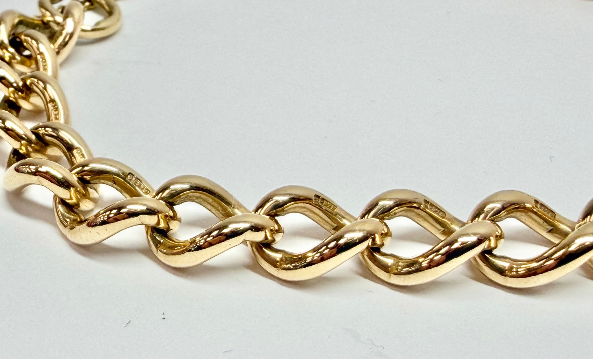 This beautiful 9ct yellow gold curb link bracelet has a heart clasp and safety chain, weighs 25.25 grams and is 7" in length. It is stamped 375 on every link.