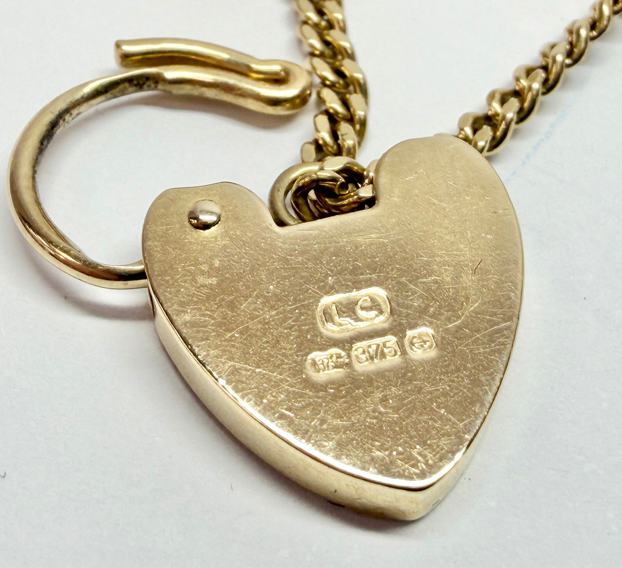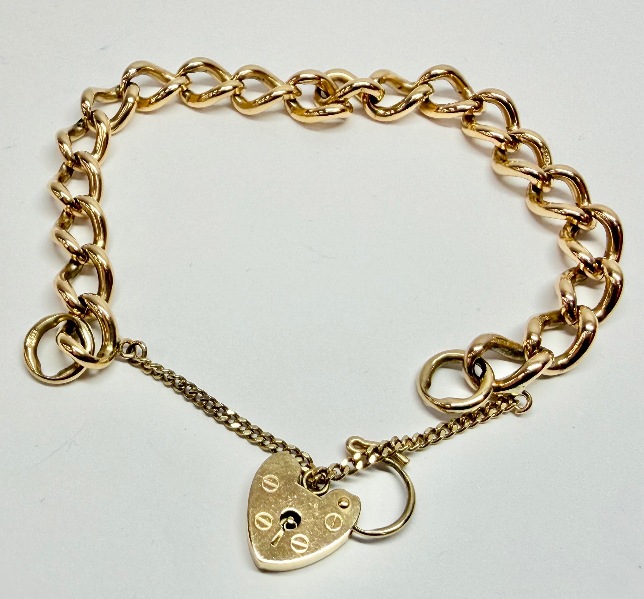 9ct yellow gold curb link bracelet with heart clasp 7"